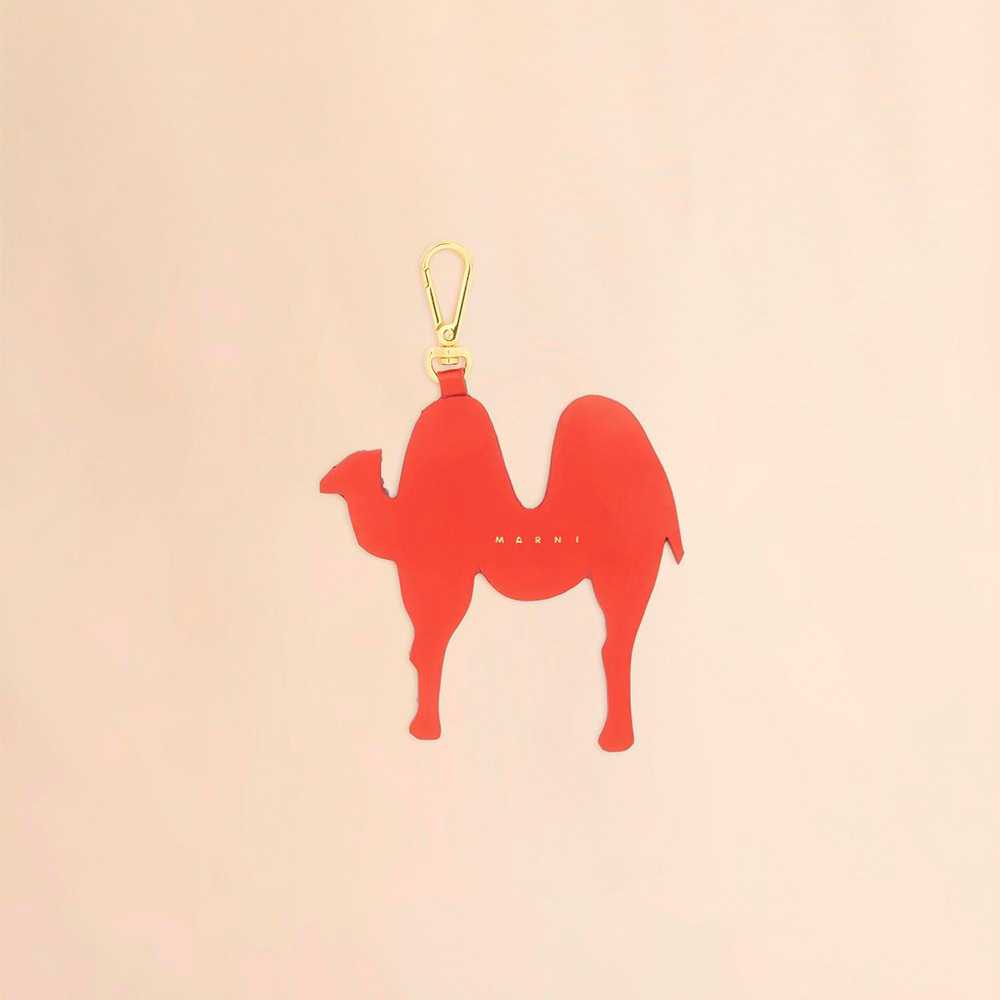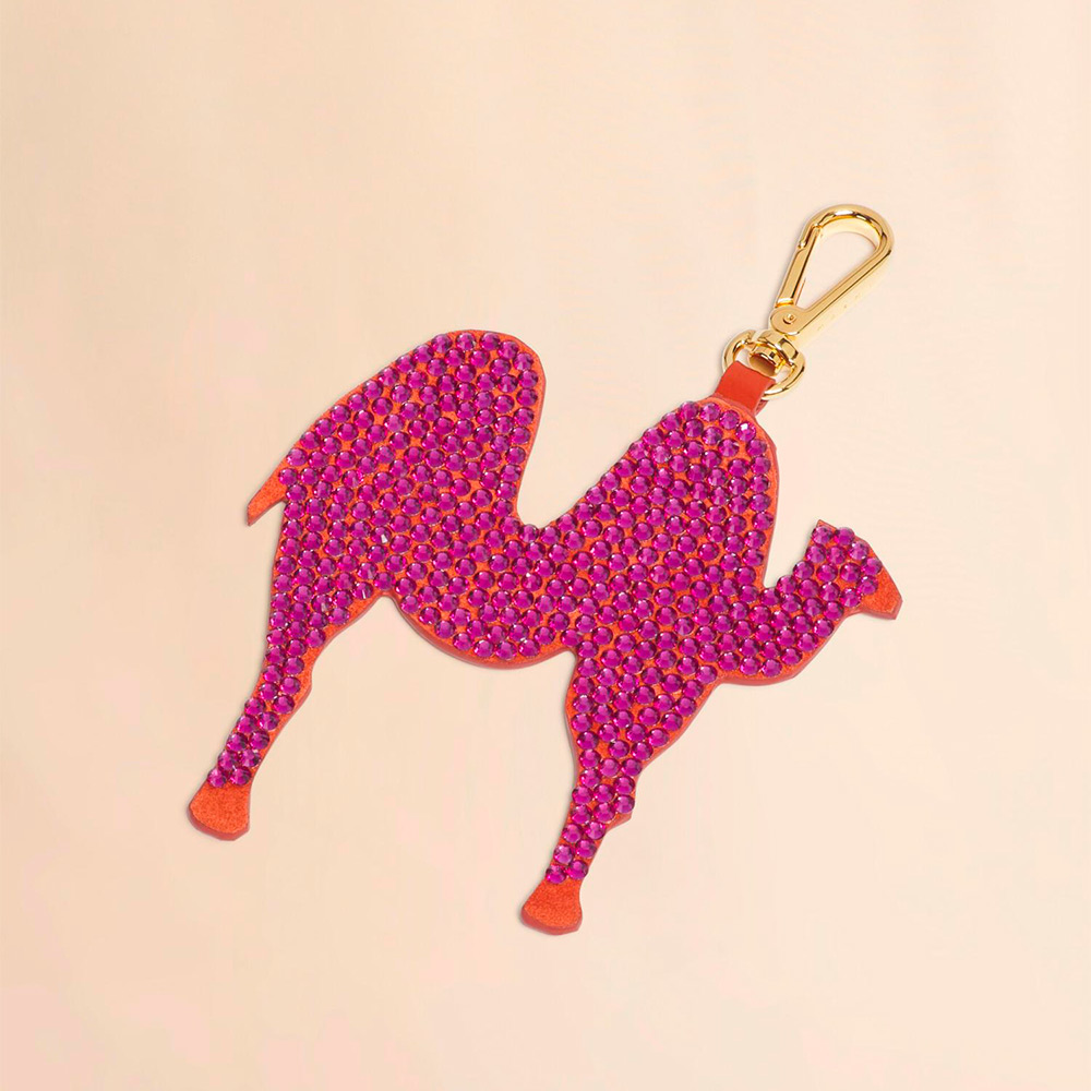 「M」をキャメルモチーフで表現したアニマルチャーム。レザーにラインストーンを施したデザイン。