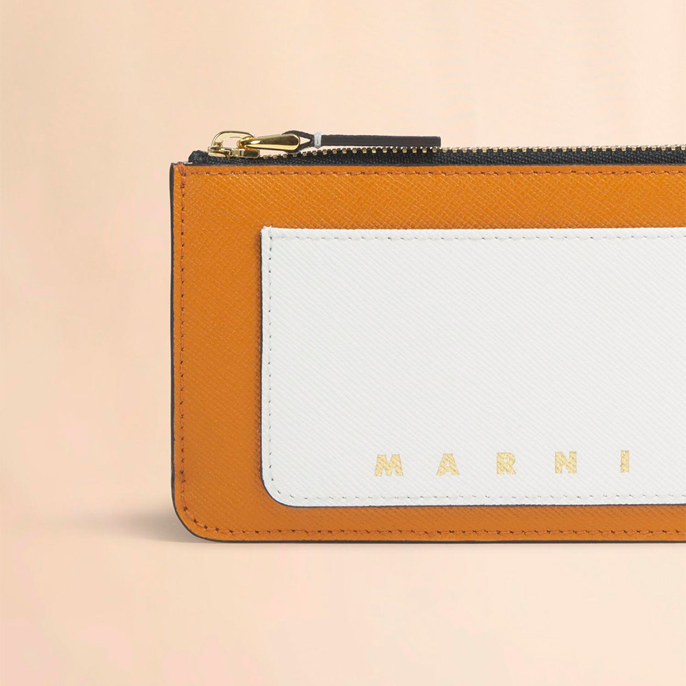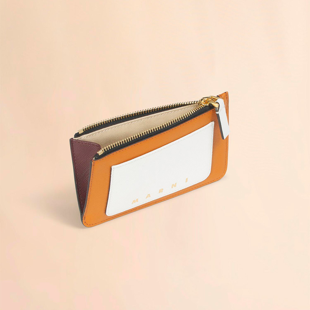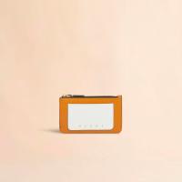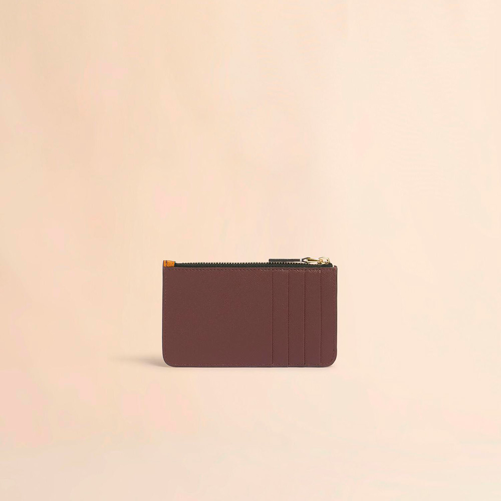 サフィアーノレザー製のカードケース。ファスナー式コインポケット1つ、背面にカードスロット4つ。フロントにロゴ入り。