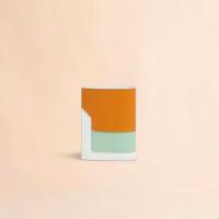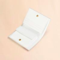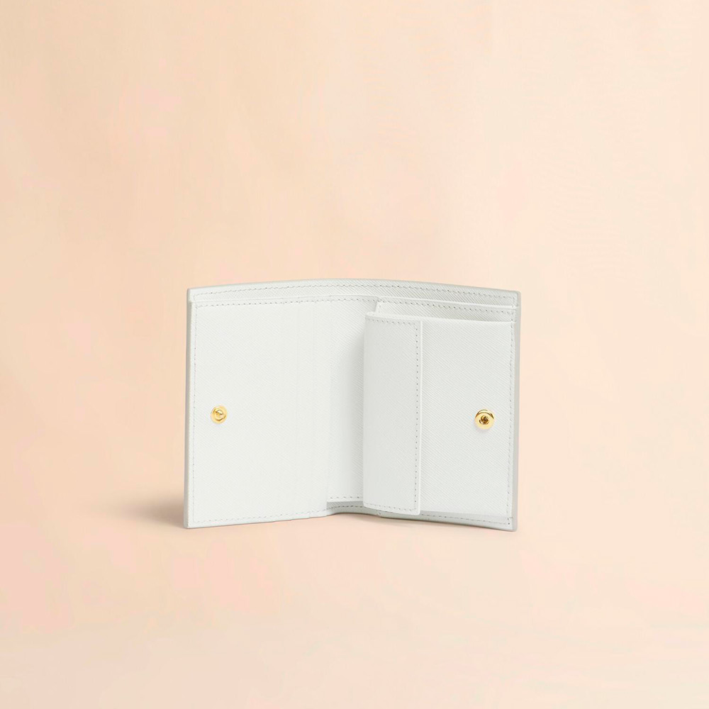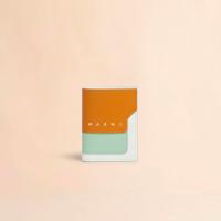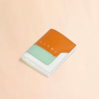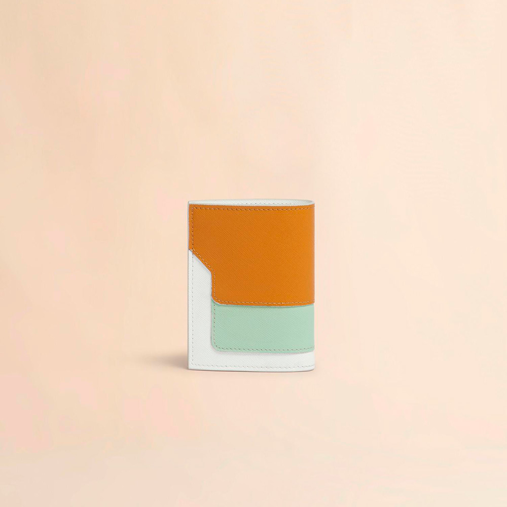 サフィアーノレザー製のカラーブロック2つ折りウォレット。紙幣入れ1つ、カードスロット4つ、コインポケット1つ。フロントにロゴ入り。
