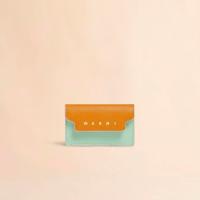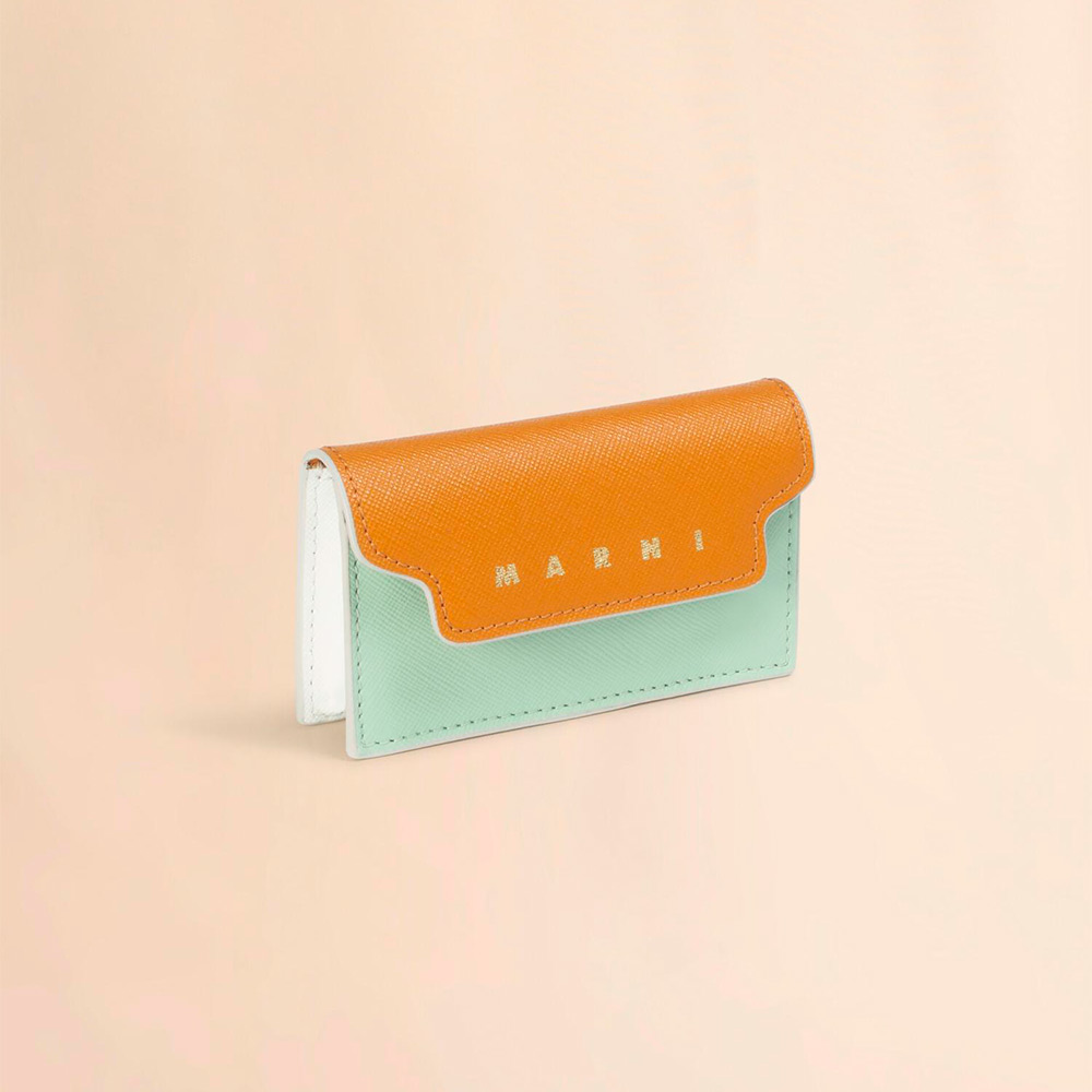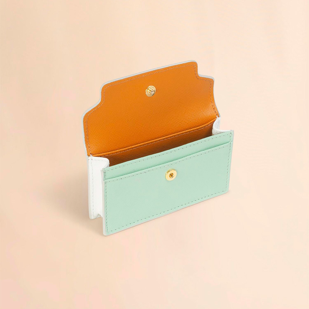 サフィアーノレザー製のカードケース。名刺入れ1つ、クレジットカードスロット1つのコンパクトなカードケース。フロントに施されたコントラストカラーのロゴがポイントに。