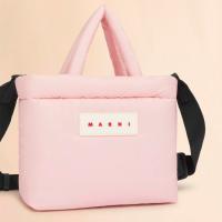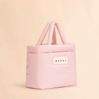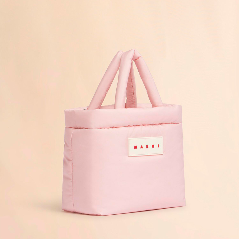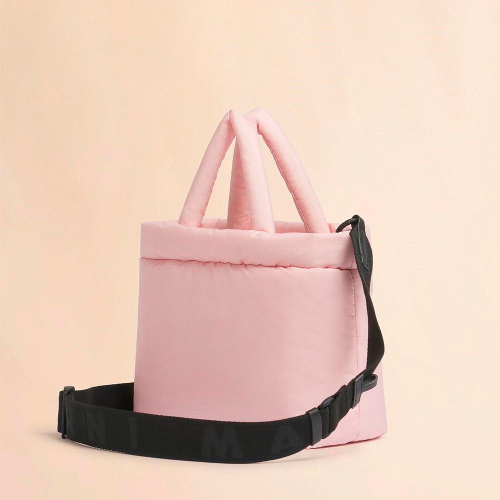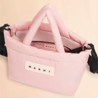 ポリエステル素材で中わた入りの軽量な「PUFF」スモールトートバッグ。ジップ開閉式。長さ調節が可能なショルダーストラップ付き。フロントのロゴラバーパッチがポイント。