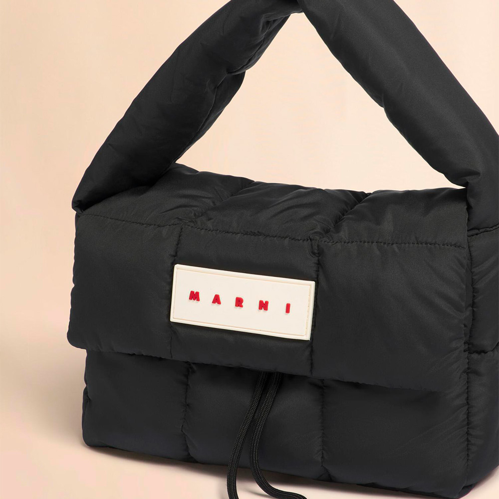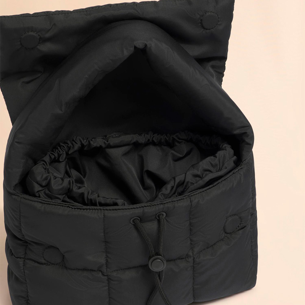 軽やかなキルティング素材の「PUFF」ショルダーバッグ。幅広のショルダーストラップは肩にやさしくフィットし、デイリーユースに最適。フラップ部分にセーフティーマグネットが付属、内側はドローストリング仕様。フロントのラバーロゴパッチがアクセントに。