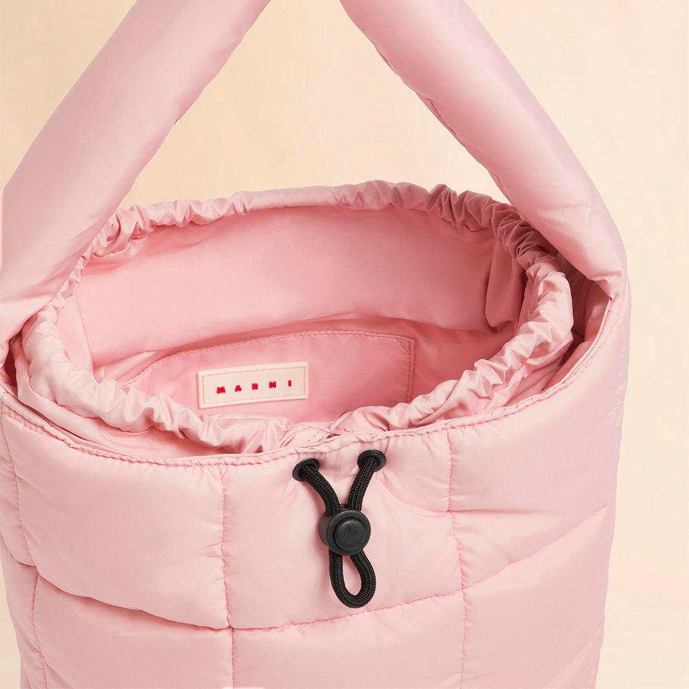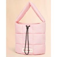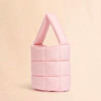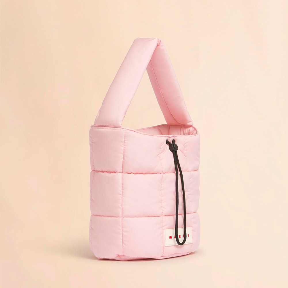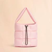 軽やかなキルティング素材の「PUFF」バケットバッグ。軽量かつ収納力のある広めのマチがデイリーユースに最適。幅広のショルダーストラップは肩にやさしくフィット。開口部はドローストリング仕様、内側にストッロポケット付き。フロントのラバーロゴパッチがアクセントに。