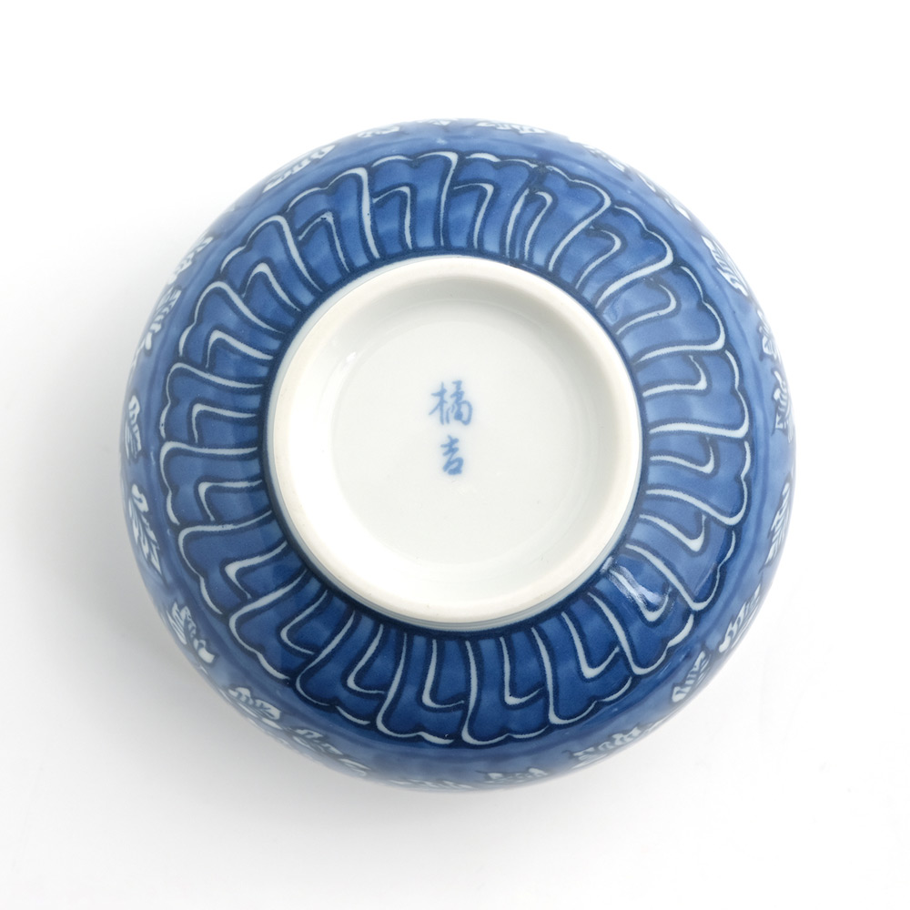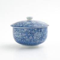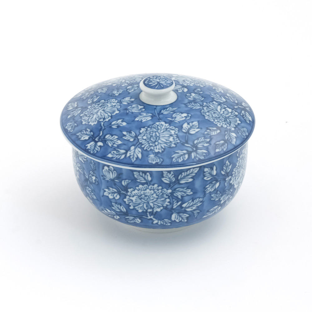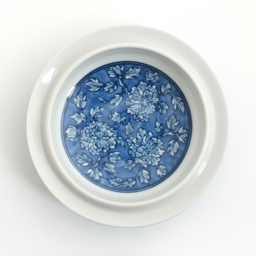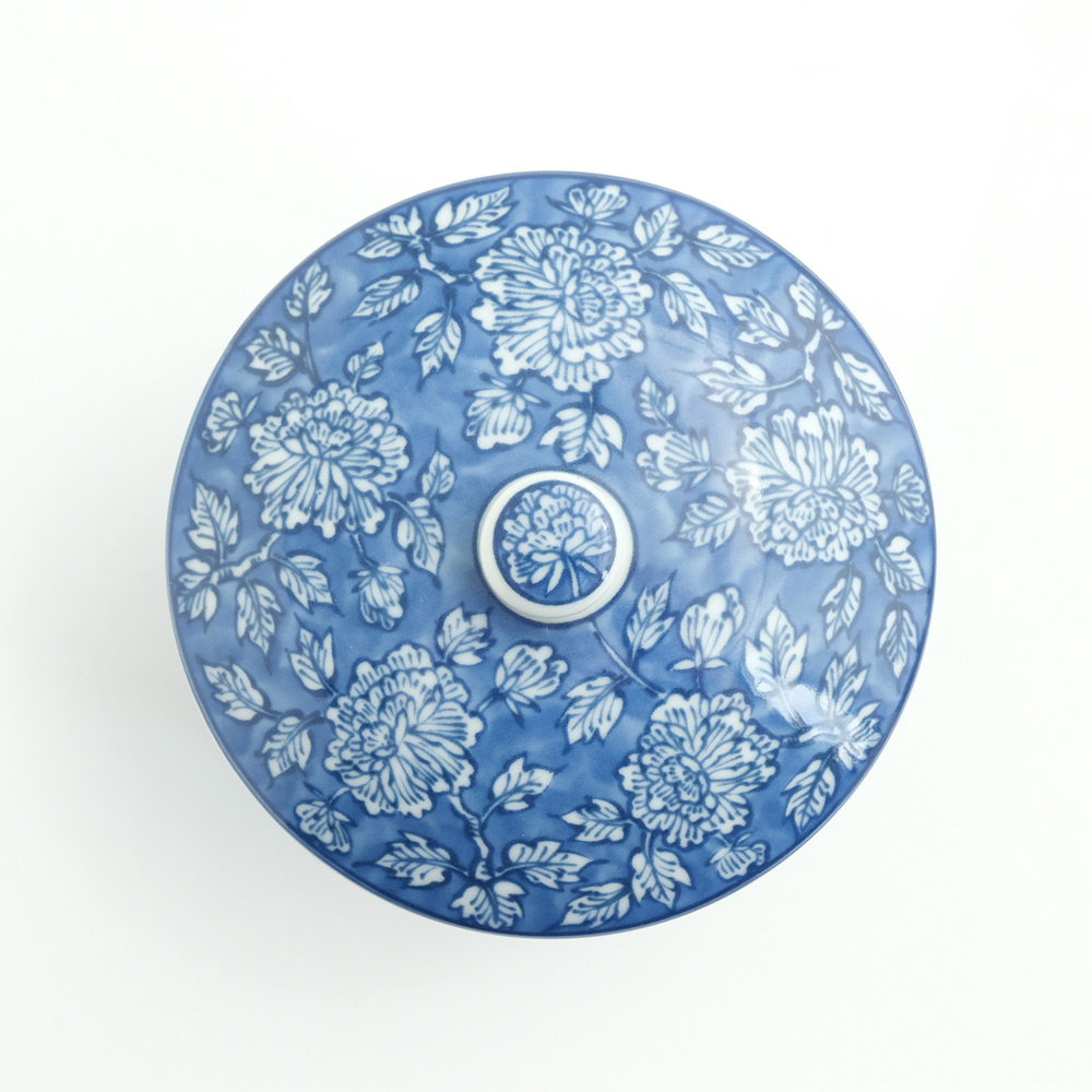 深みのある藍色をふんだんに使い、咲き誇る牡丹の華やぎを表現したお茶呑茶碗です。蓋を開ければ、裏にも牡丹が咲き誇り、大切なお客様のおもてなしの席に色を添えます。