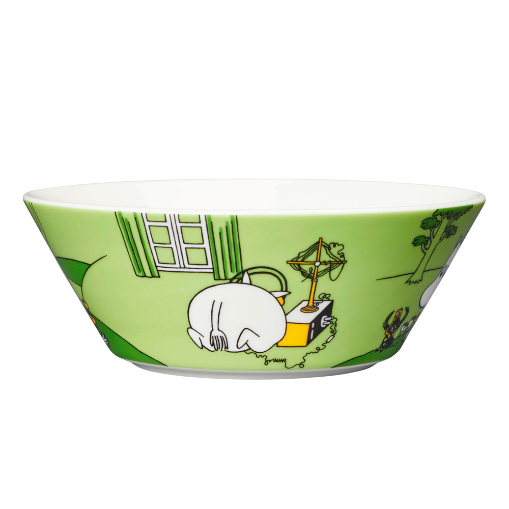 2019年にデザインが一新された「クラシック」シリーズのムーミン。1957年に発表されたコミックス「まいごの火星人」からのワンシーンです。ムーミンはラジオで何かが地球に向かって飛んできているとの警告を耳にします。そして何かがムーミンママのお台所に落ちてくるのです。ムーミンはまいごの火星人を隠してあげますが、警察までも探しに来ます。でもムーミンとまいごの火星人は、魔法の箱を通して、ちゃんと話ができるのです。