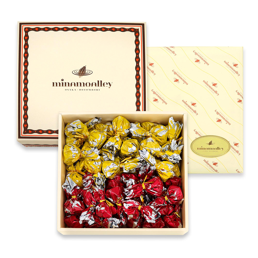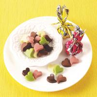 ハートの形のプチチョコレート。一包みで3つの風味(赤色の巾着:イチゴ・ダーク・ミルク、黄色の巾着:レモン・抹茶・ミルク)が楽しめます。お取り分けにもぴったりです。