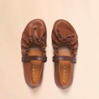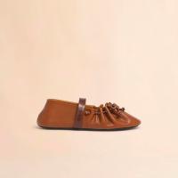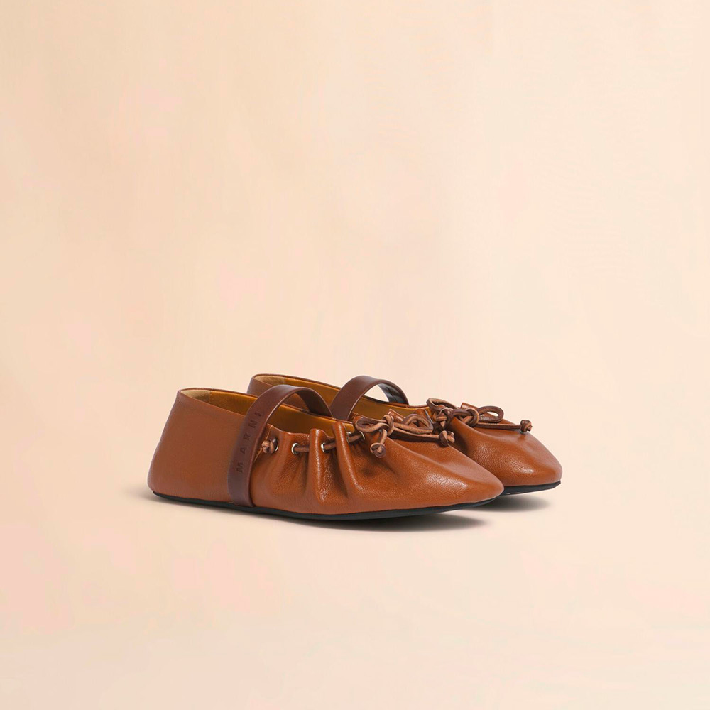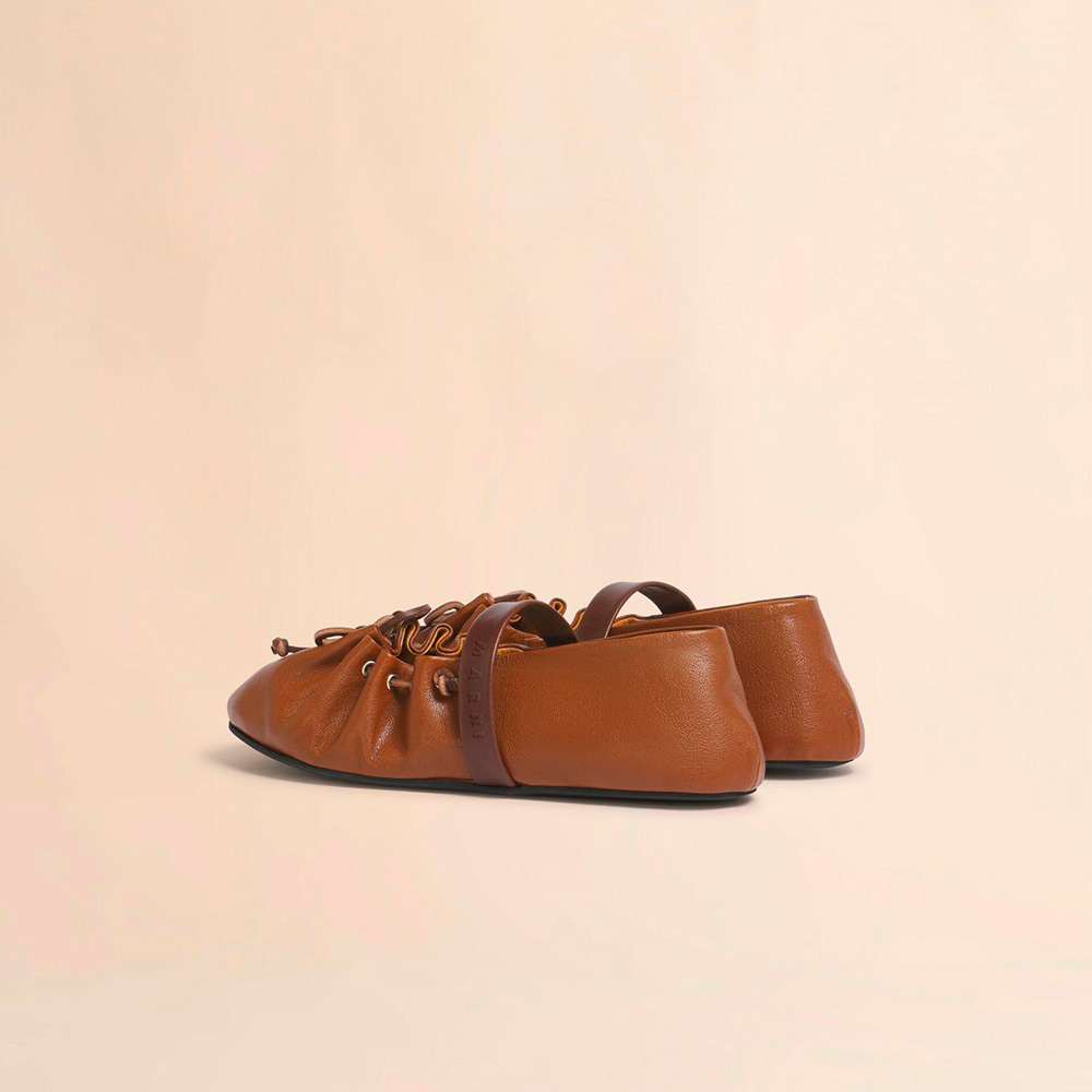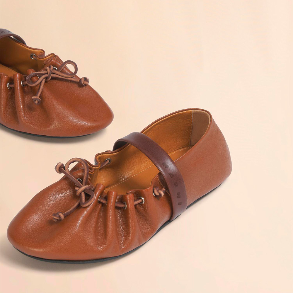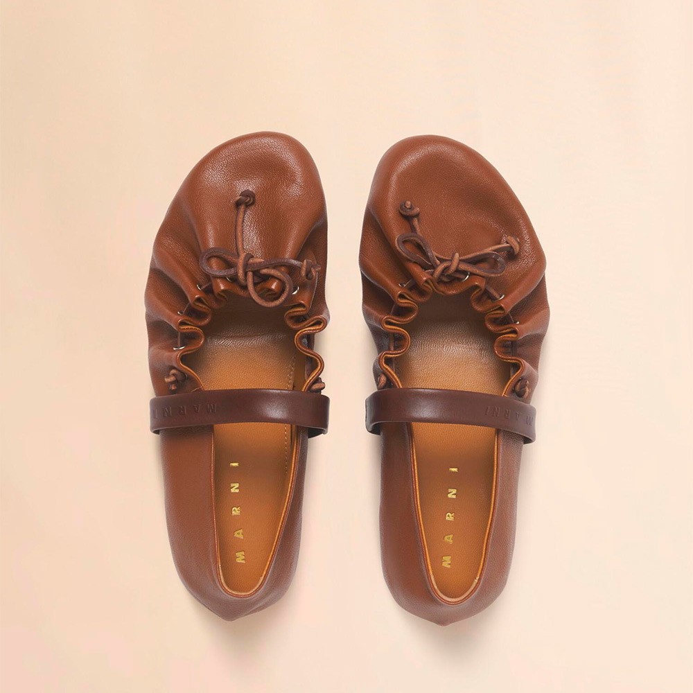バレリーナシューズとアーカイブコレクションのギャザーシューズを融合した“SOFT BALLERINA”シューズ。レザーレースリボンで甲部分の調整可能。ストレッチの効いたレザーストラップ付き。