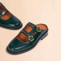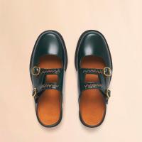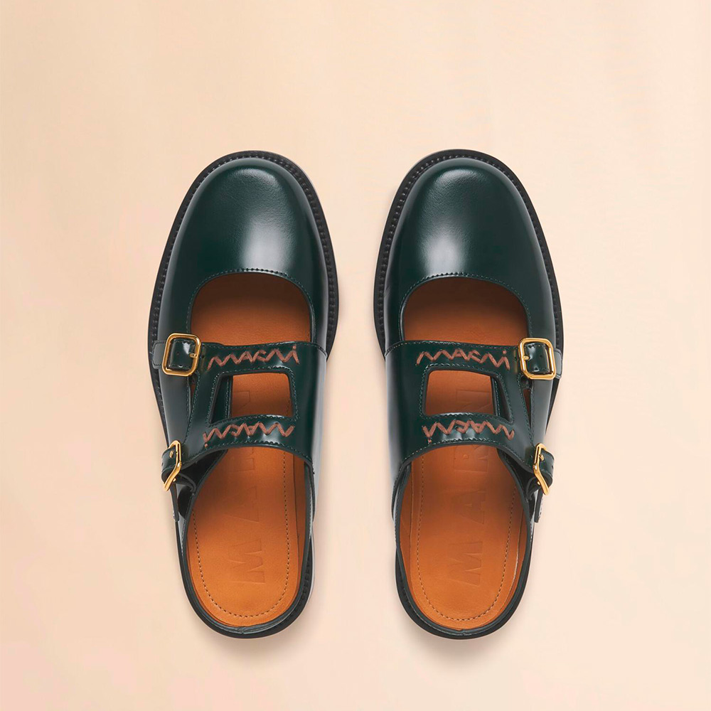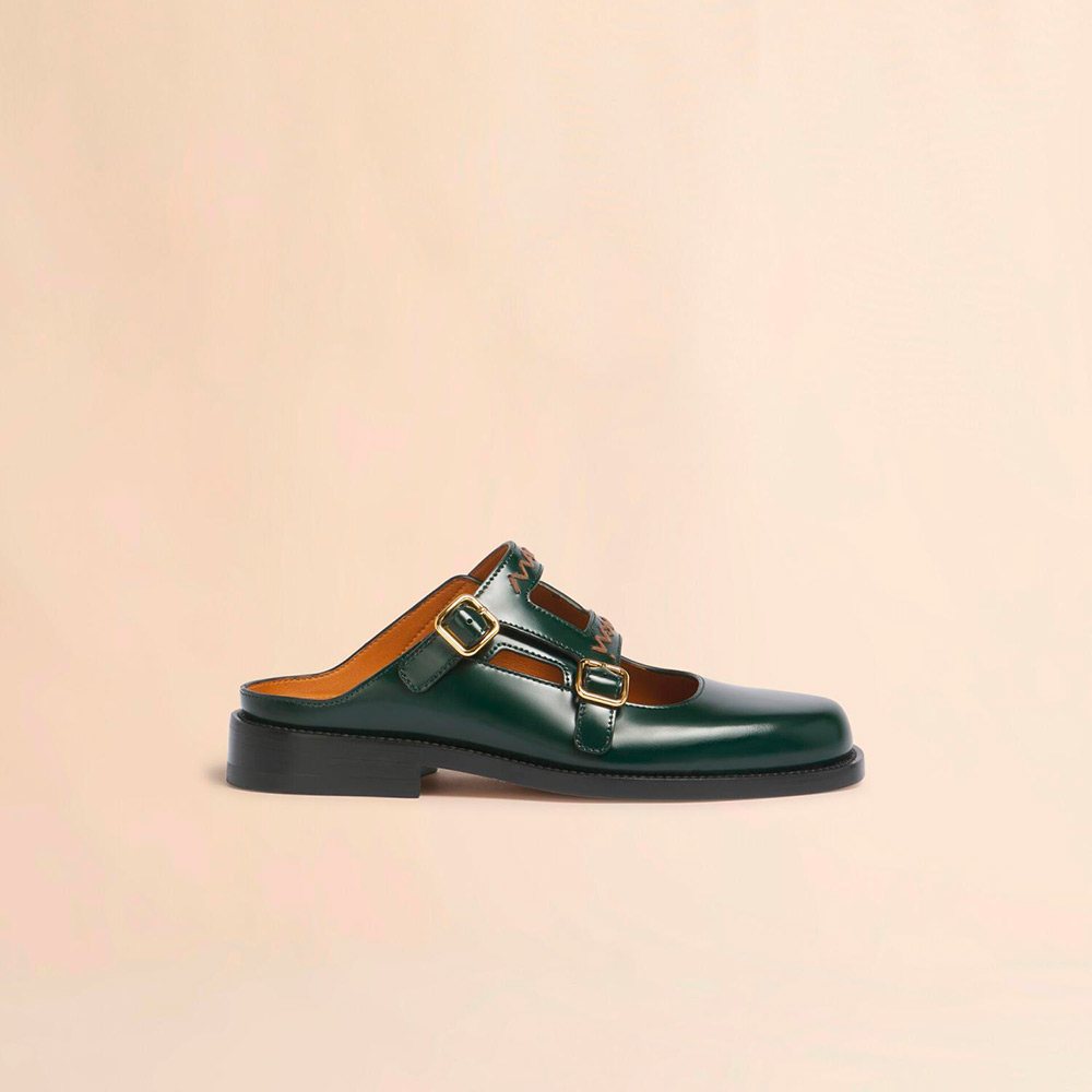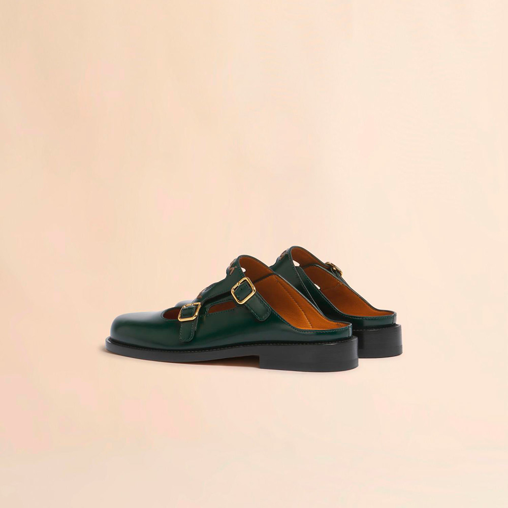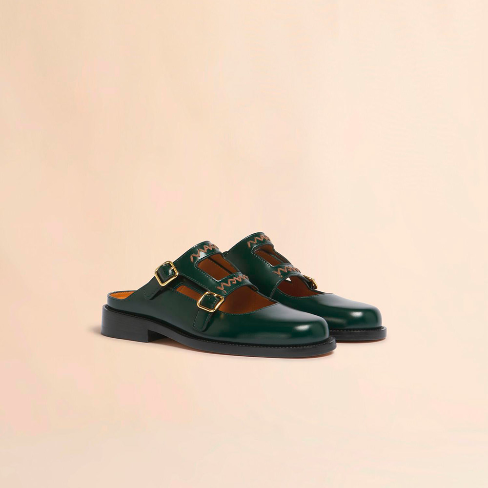 ポリッシュドカーフレザー製のサボ。ダブルストラップ仕様。ハンドステッチで施されたコントラストカラーのシンボルロゴがアクセントに。