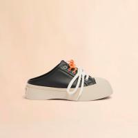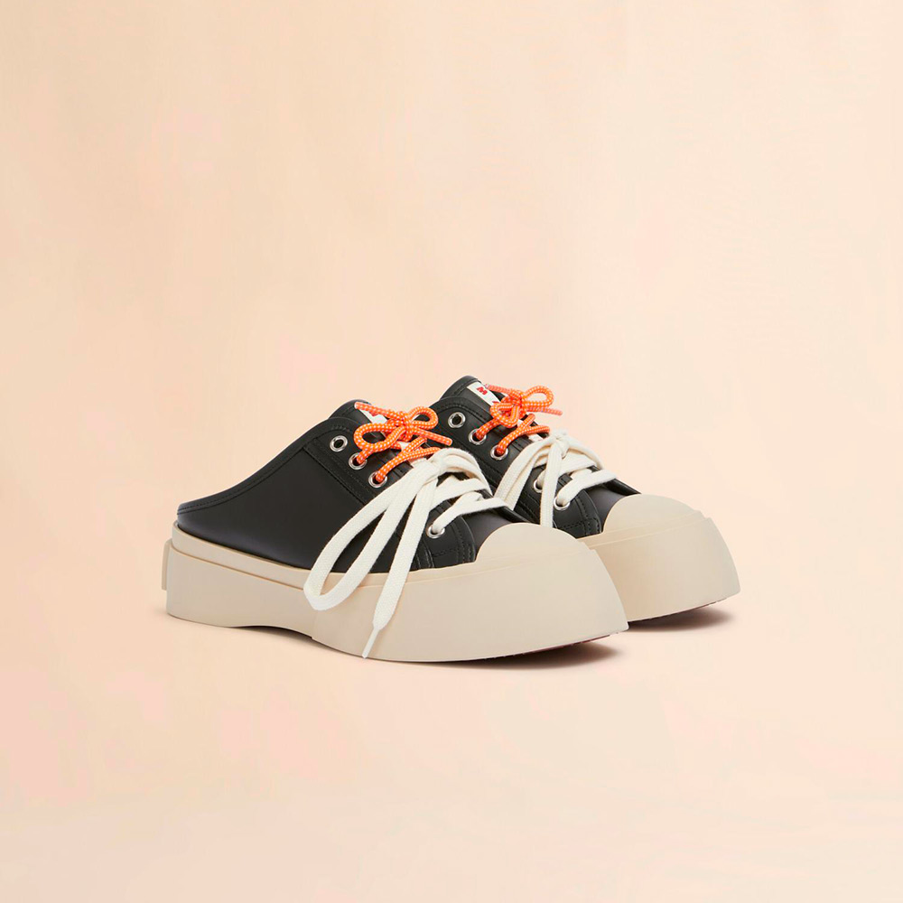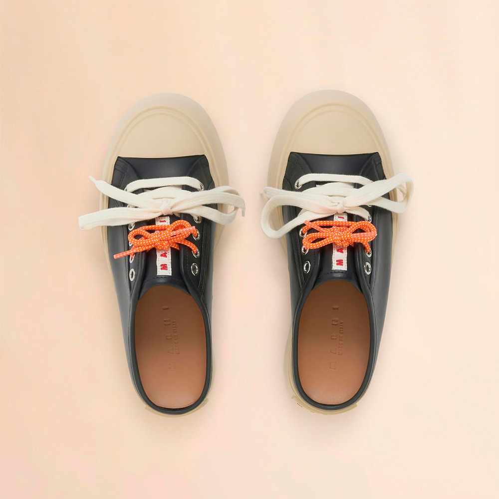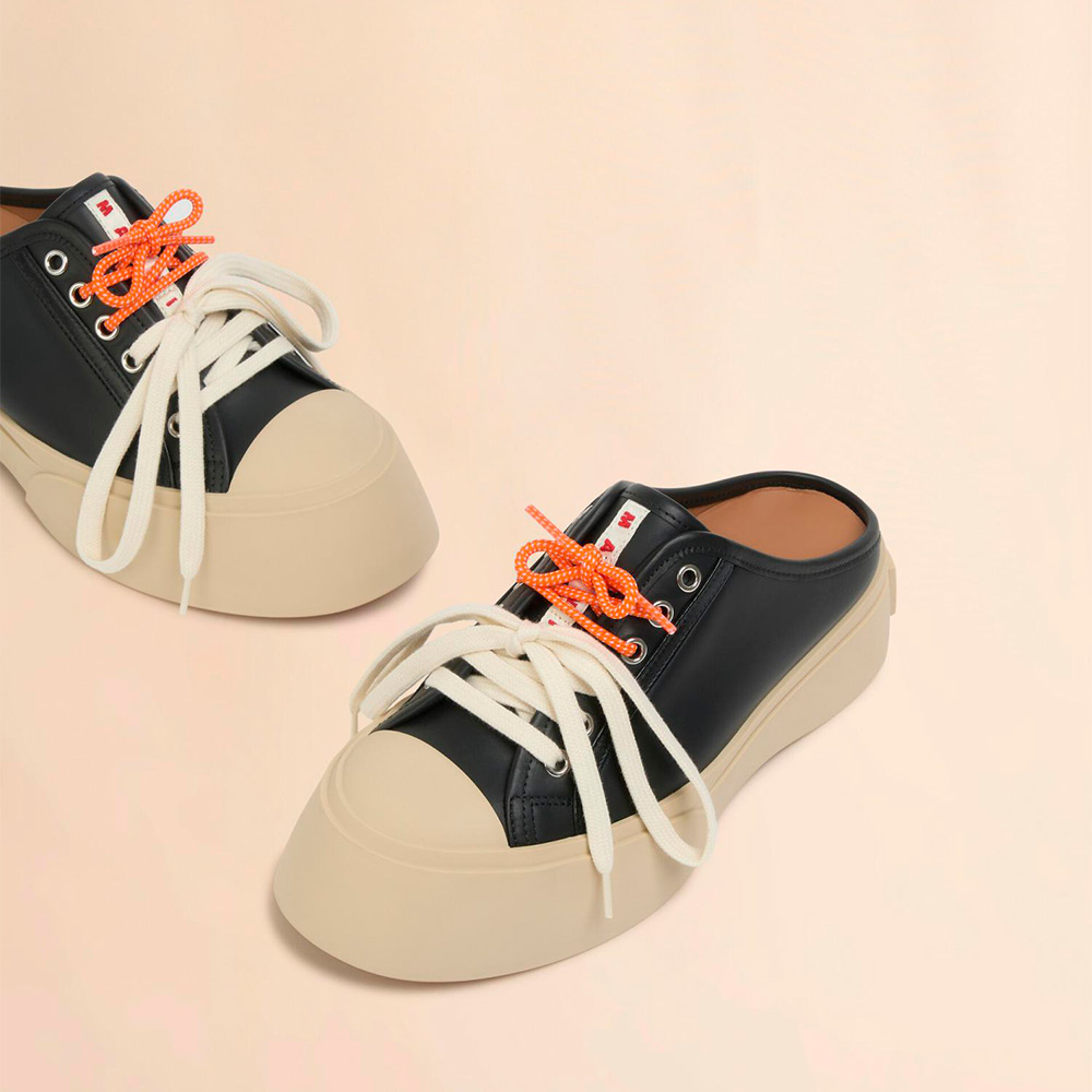 カーフレザー製の”PABLO”レースアップサボ。レザーライニングでシューズのタンにロゴ入りラベル付き。 コントラストカラーの2種類のシューレースが付属したダブルレース仕様。プラットフォームソールの背面にほどこされたロゴがアクセントに。