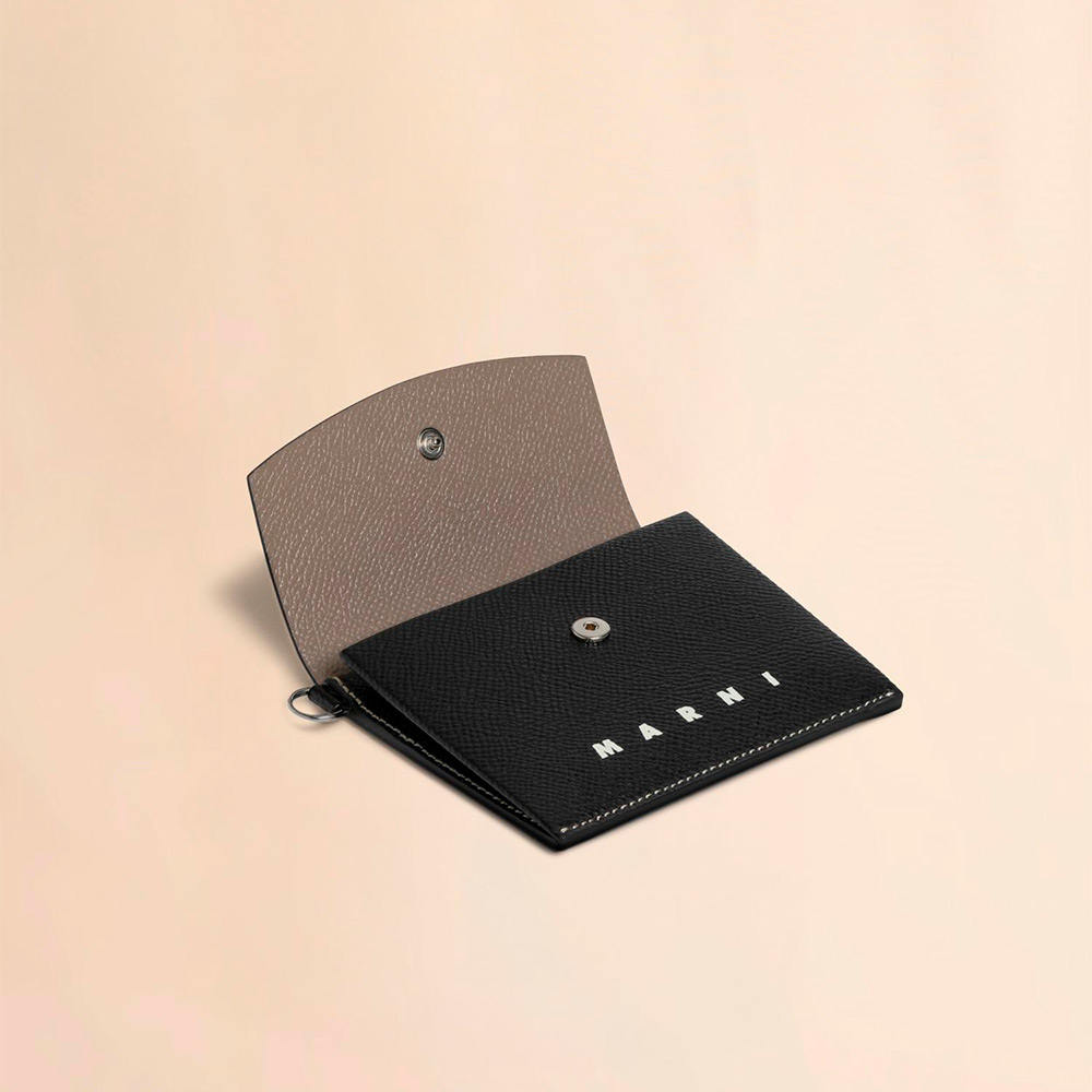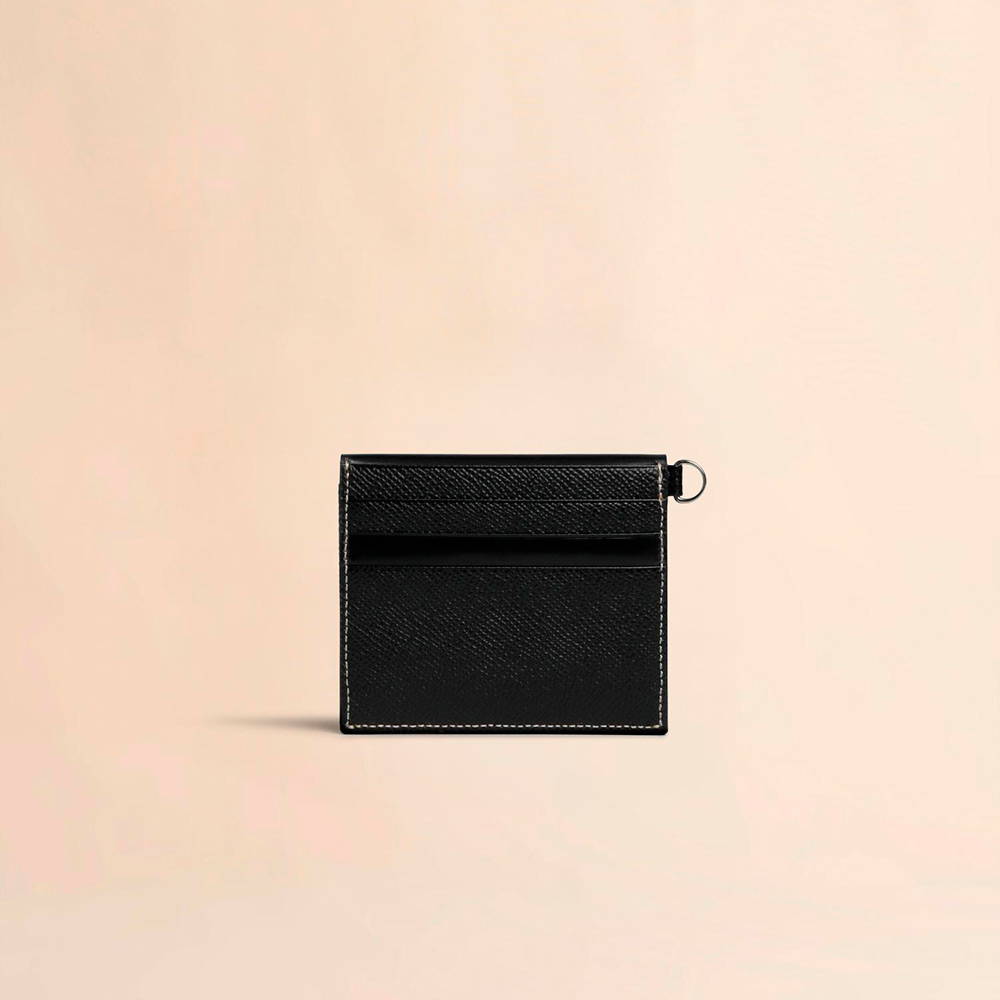 コードバンとカーフレザー製のミニマルなデザインのミニウォレット。チャームを付けられる金属パーツが付属。紙幣や硬貨も入るスナップボタン開閉式のコンパートメント1つ、内側にカードスロット1つ。背面にカードスロット4つ。フロントにロゴ入り。