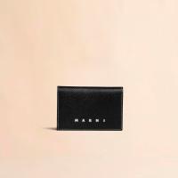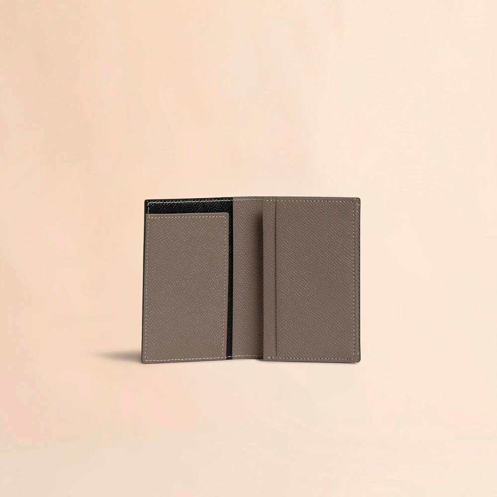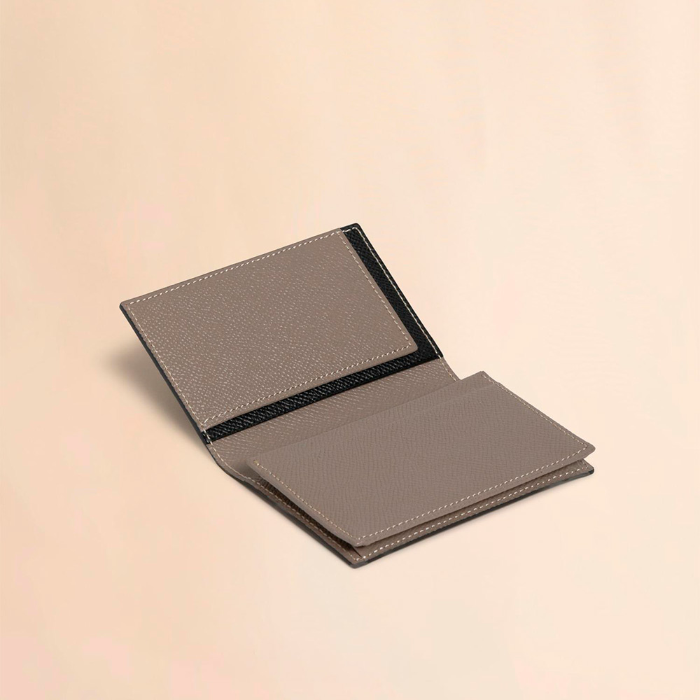 カーフレザー製のカードケース。ビジネスカードを40枚程度収納可能なメインコンパートメント1つ、カードポケット2つ。フラップ裏にスリップポケット1つ。フロントにロゴ入り。