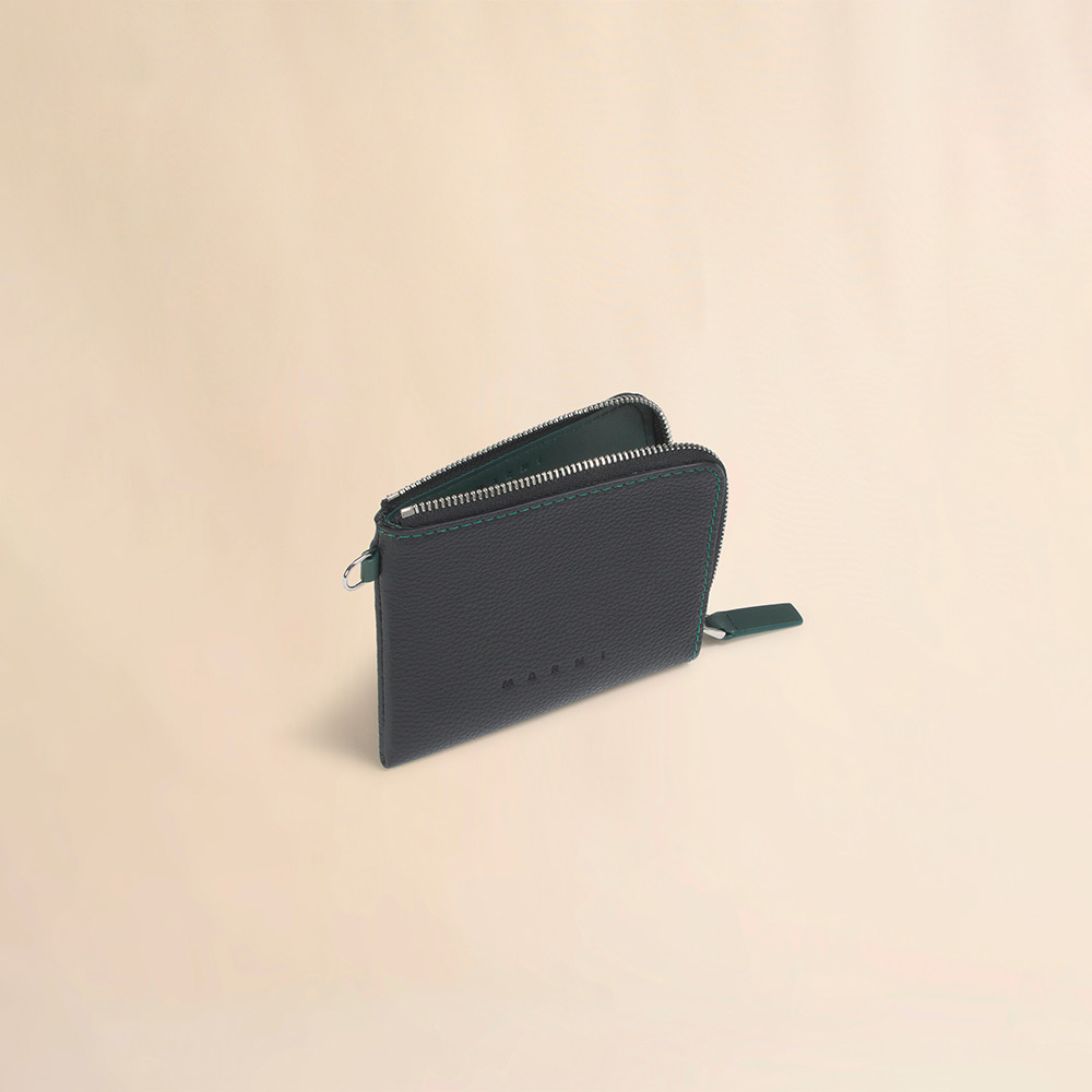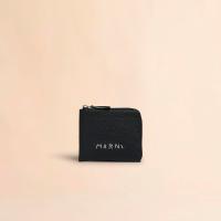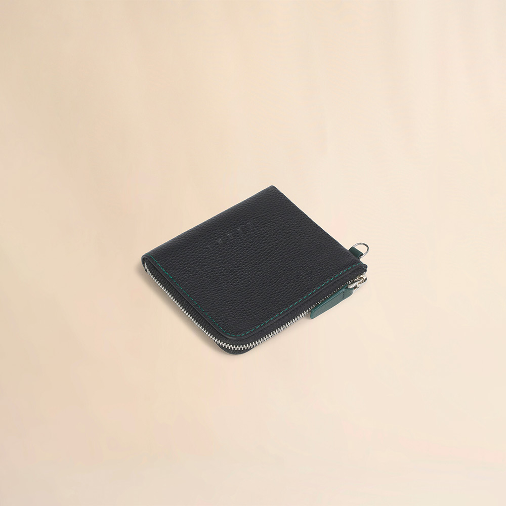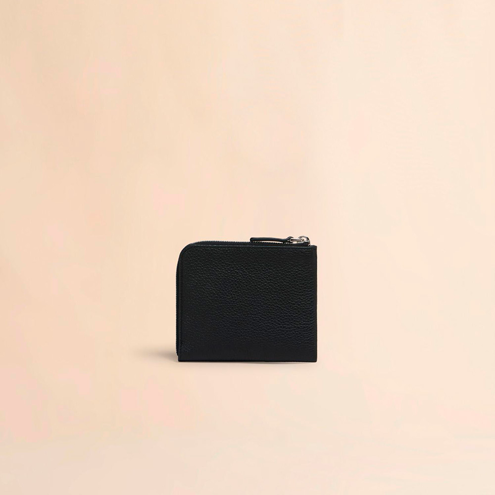 グレインレザー製の“MENDING”L字型コンパクトジップコインケース。フロントにハンドステッチで施されたメンディングロゴがアクセントに。
