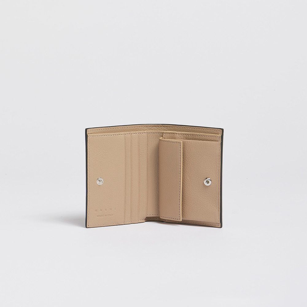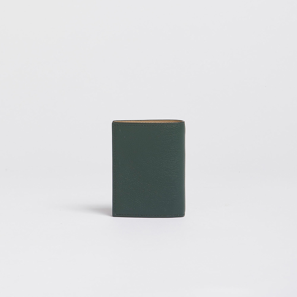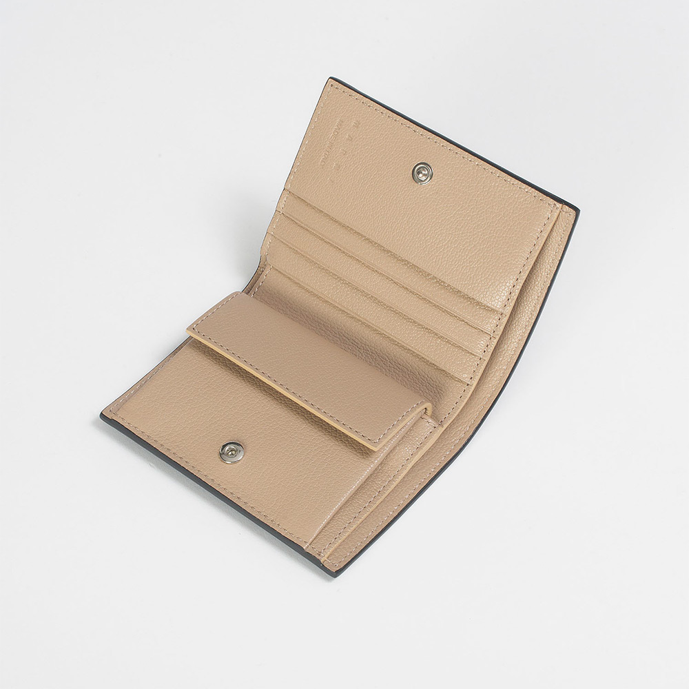 グレインレザー製の”MENDING”2つ折りウォレット。紙幣入れ1つ、カードスロット4つ、コインポケット1つ。ハンドステッチで施されたメンディングロゴがアクセントに。