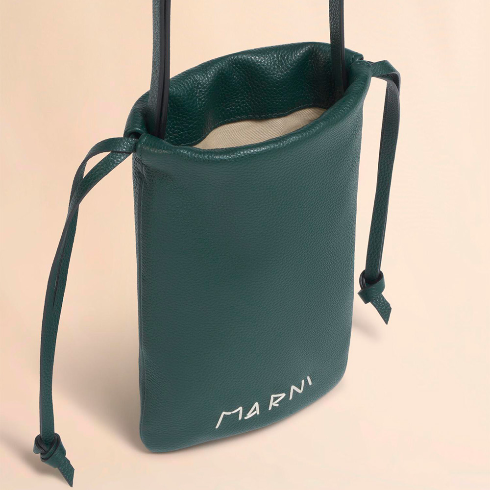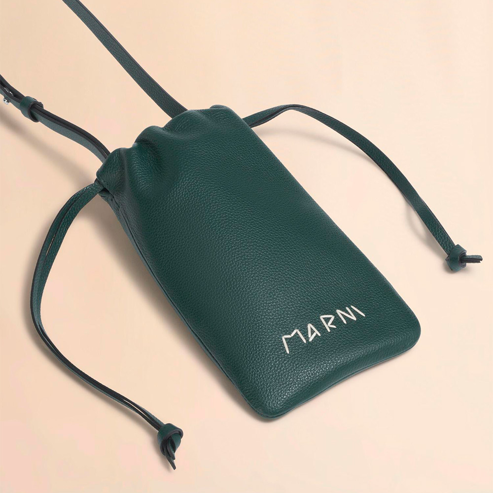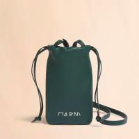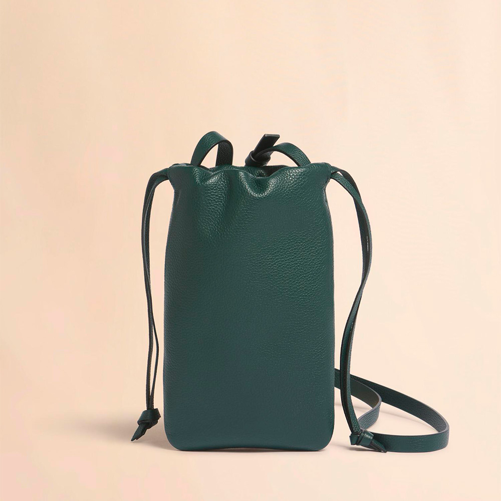 カーフレザー製の“MENDING”ショルダーバッグ。巾着型でドローストリングで絞った立体的なフォルム。フロントにハンドステッチで施されたメンディングロゴがアクセントに。