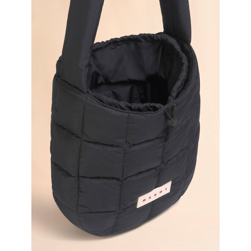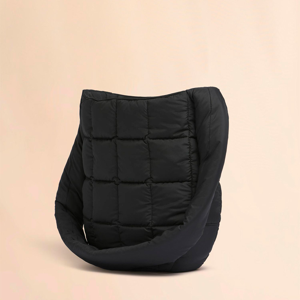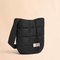 軽やかなキルティング素材の“PUFF”サックバッグ。 開口部はドローストリング仕様で、A4サイズを収納できる実用性を完備。内側にスロットポケット付き。フロントのラバーロゴパッチがアクセントに。