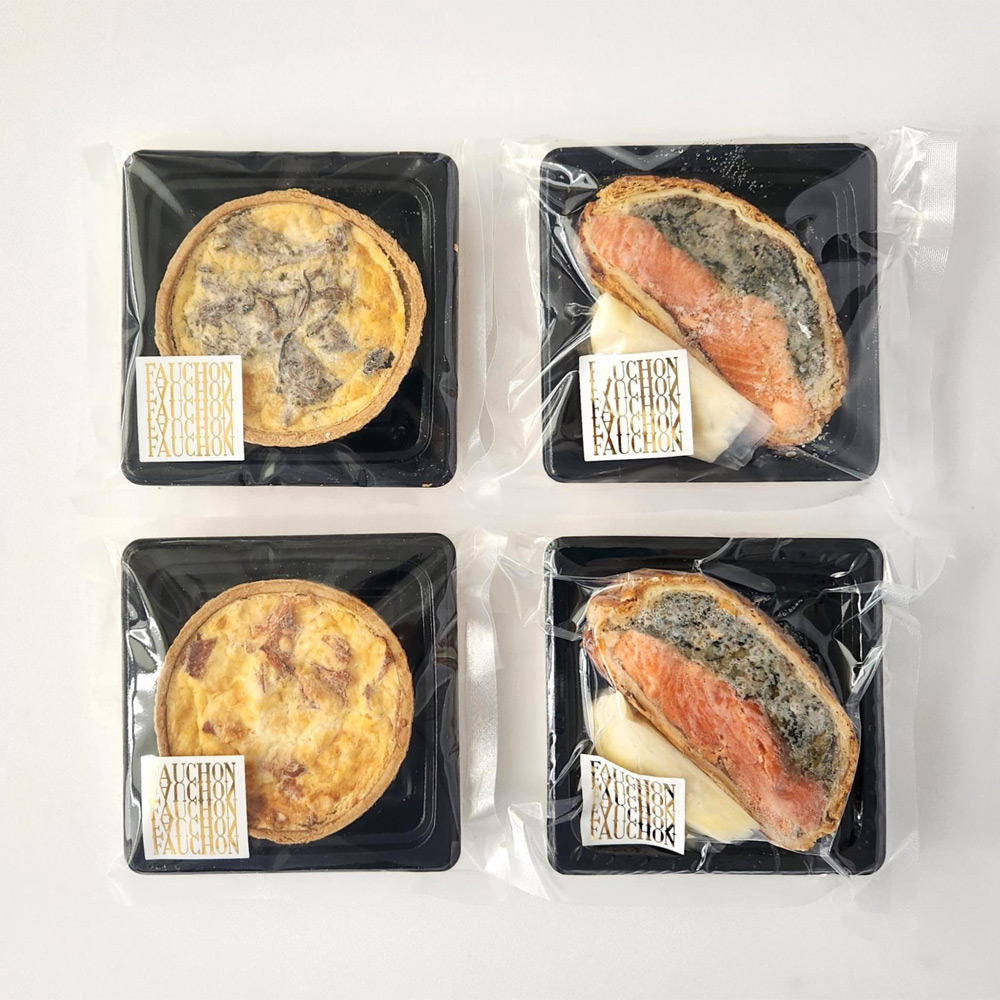 1886年、フランス・パリにて創業した「フォション」。日本では現在、フォションの惣菜を購入できるのは髙島屋日本橋店と新宿店の「フォション ガストロノミ」のみです。一番人気商品のサーモンのパイ包み焼き×2個と、ハムとベーコンのキッシュ×1個、きのこのキッシュ×1個をご自宅用のセットにしました。