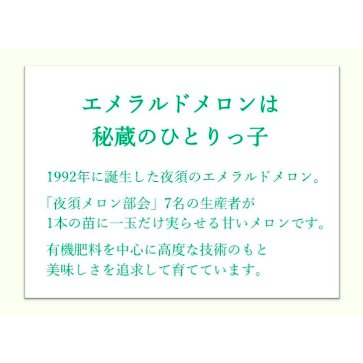 エメラルドメロンは太陽の光と昼夜の寒暖差だけでなく、肥料・湿度管理などにもこだわり特別に美味しくなるように育てられています。1本の苗に1玉だけ栽培する事により栄養を十分に吸収し、圧倒的な甘さを持って出荷されます。