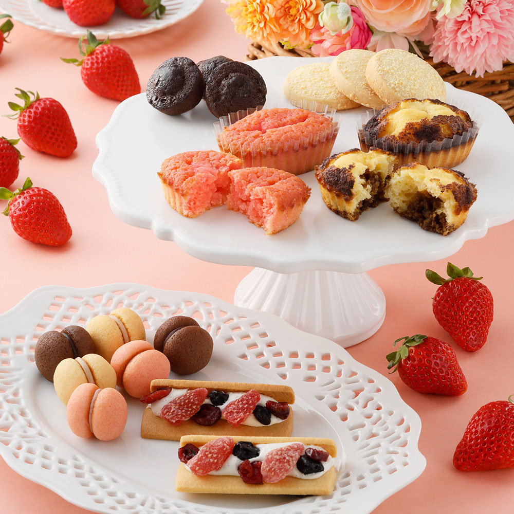<焼きティラミス いちご>春らしいピンク色のいちご味の焼きティラミスです。いちごペーストを使用した生地に、ジューシーな味わいのいちごソースを後入れ注入。華やかな味わいがお口いっぱいに広がります。<焼きティラミス>こだわりの北海道産マスカルポーネと北海道産小麦を使用したスポンジに、ほろ苦いコーヒーシロップを一つ一つていねいに染み込ませました。<サクッチ・ホロッチ>ほろほろ食感のクッキーにチョコをサンドしました。毎日でも食べたくなってしまう、ちょっとした贈りものにもぴったりのコロンと可愛いクッキーです。<ベリーウィッチ>ストロベリー、クランベリー、ブルーベリーのドライフルーツをバニラペーストとホワイトチョコを使用したクリームにトッピング。サクサク食感のサブレとの相性は抜群です。<芳醇チーズサブレ>発酵バター入りのサブレ生地に、たっぷりチーズをトッピングした芳醇な味わいでほろほろ食感のチーズサブレ。<ハイカカオブラウニー>チョコの濃厚感とカカオニブのほろ苦さが詰まった、ひと口サイズのブラウニー。