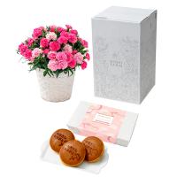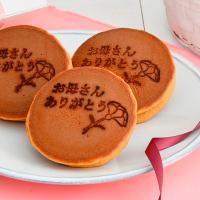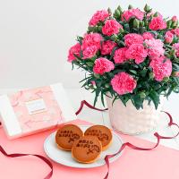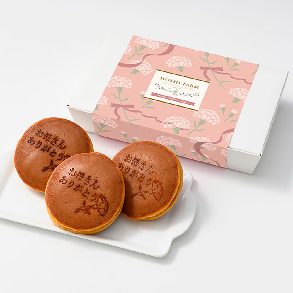 可愛らしいカーネーションとメッセージ入りのしっとりどら焼き。