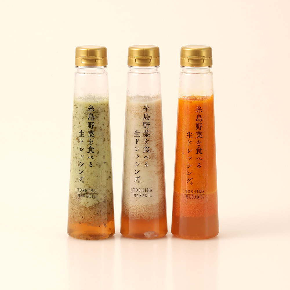 糸島野菜のすりおろしがたっぷり入った生ドレッシング。非加熱製法により、通常の約3倍もの酵素を取り入れられる身体に優しいドレッシングです。
