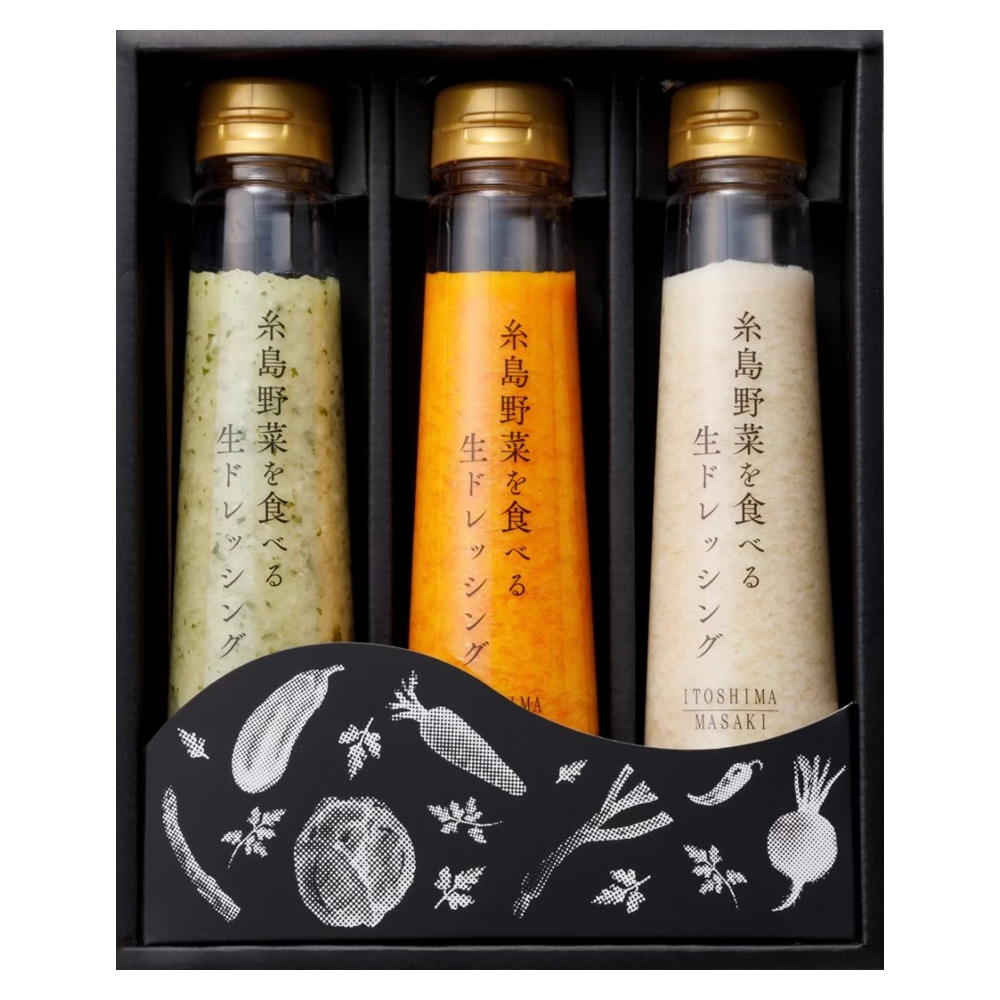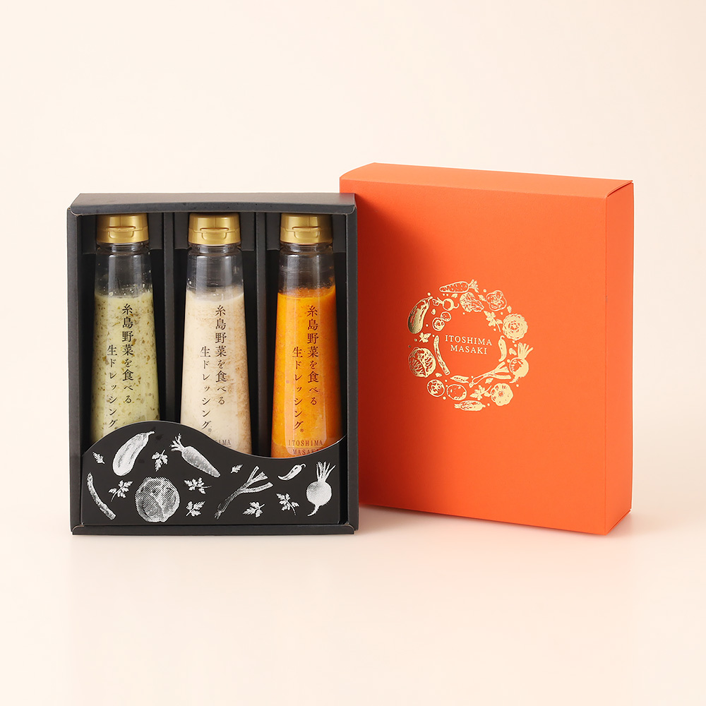 寒暖差のある気候で育った糸島野菜の甘みが引き立つように、酸味は控えめ。生野菜をそのまますりおろしているので、つぶつぶとした食感が楽しめ、まさに「食べる」ドレッシング。油の使用を控えめにしているのでカロリーは3分の1と体に優しいのも魅力。サラダはもちろん、魚介や肉料理のソースとしても活躍します。※「お母さんありがとう」のメッセージ入りの掛け紙をかけてお届けします。