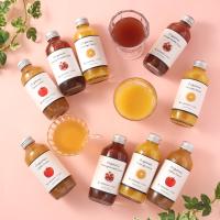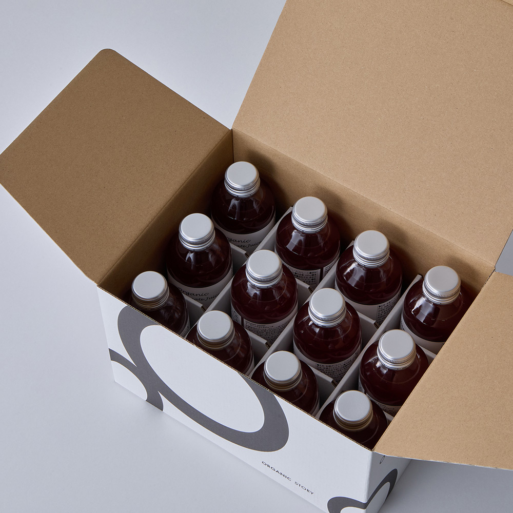 有機栽培の果物を、ぎゅっと搾ったストレート果汁100%のオーガニックジュース。ブランドロゴをデザインしたギフトボックスはシンプルながらスタイリッシュ。