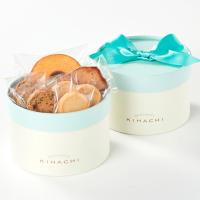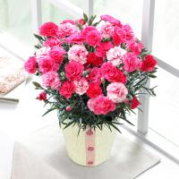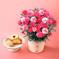 さまざまなピンク色が楽しめる八重咲きのカーネーションと<パティスリー キハチ>の焼菓子をセットでお届け。