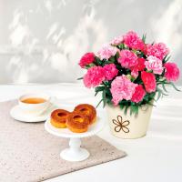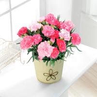 濃いローズピンクから淡いピンクへのグラデーションが美しいカーネーションと<T.D.Early>キャラメリゼバウムをセットでお届け。