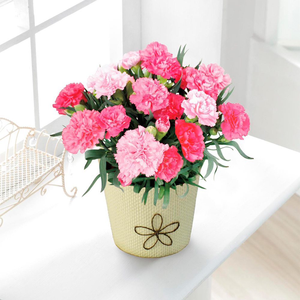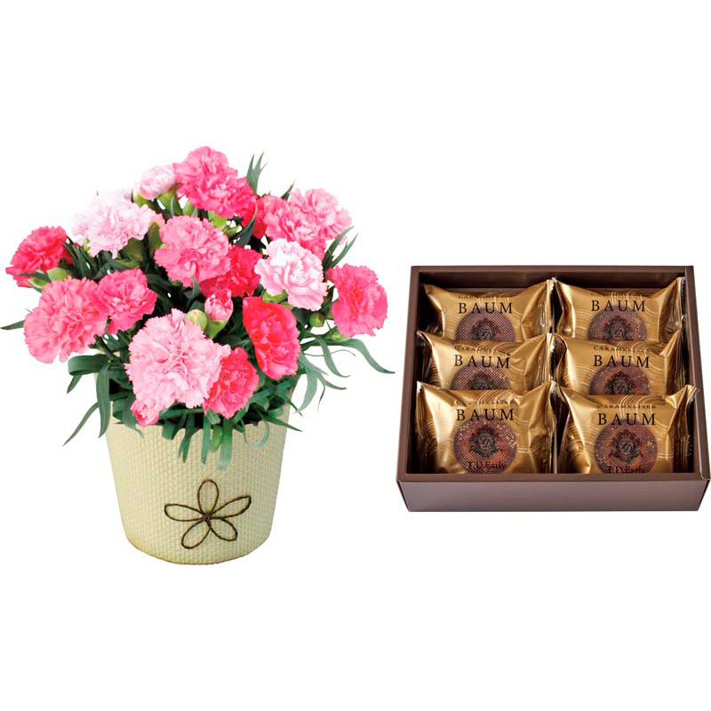 キャラメリゼバウム×6、カーネーション4号鉢、バスケット、お手入れのしおり