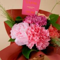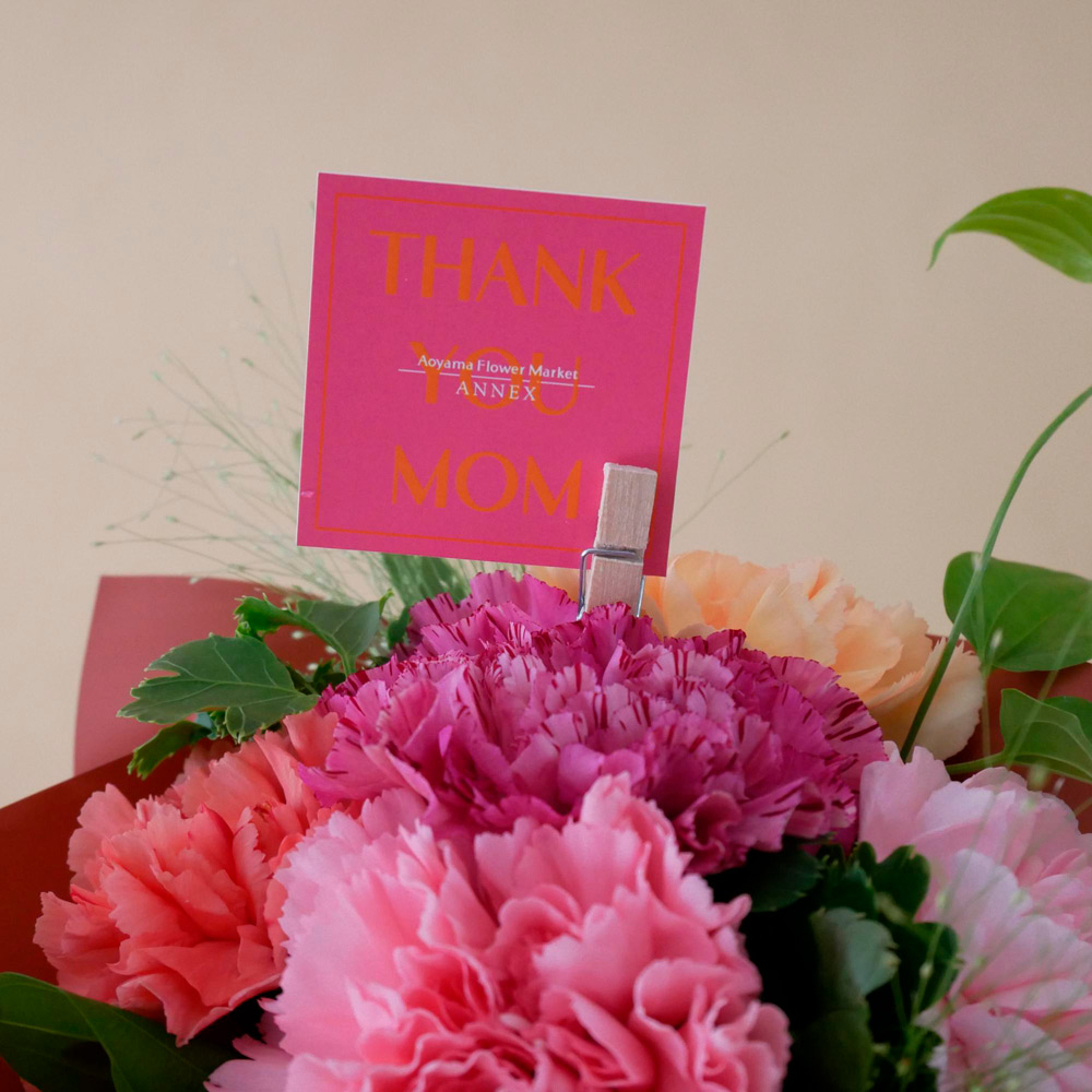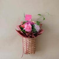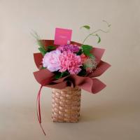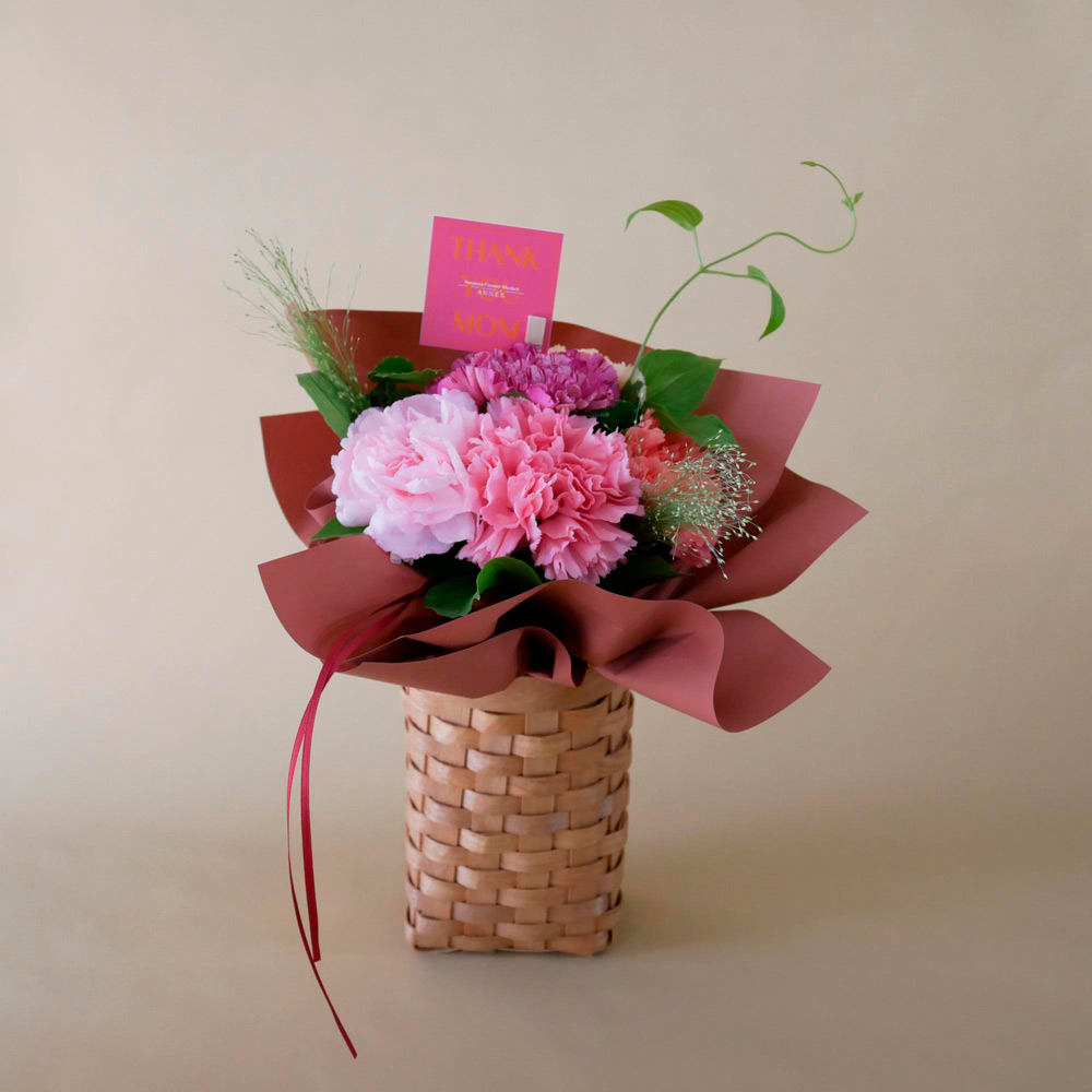 壁掛けでも、置いても飾ることができる、バスケット入りのブーケです。ブーケを保水ゼリーで包んでいるので、お届けから数日はそのままお楽しみいただけます。「ありがとう」の気持ちを込めた母の日ギフトにぴったりです。