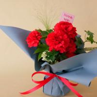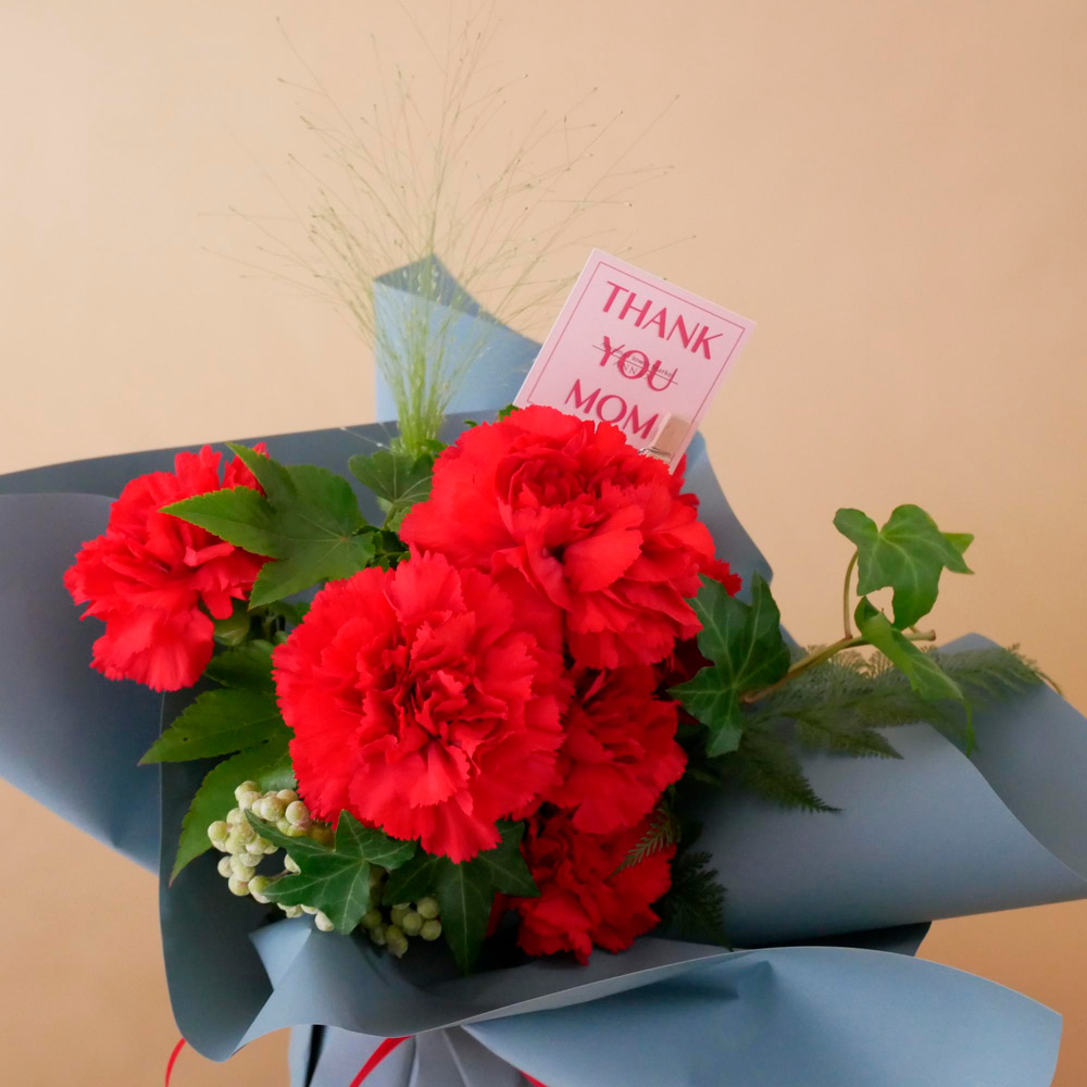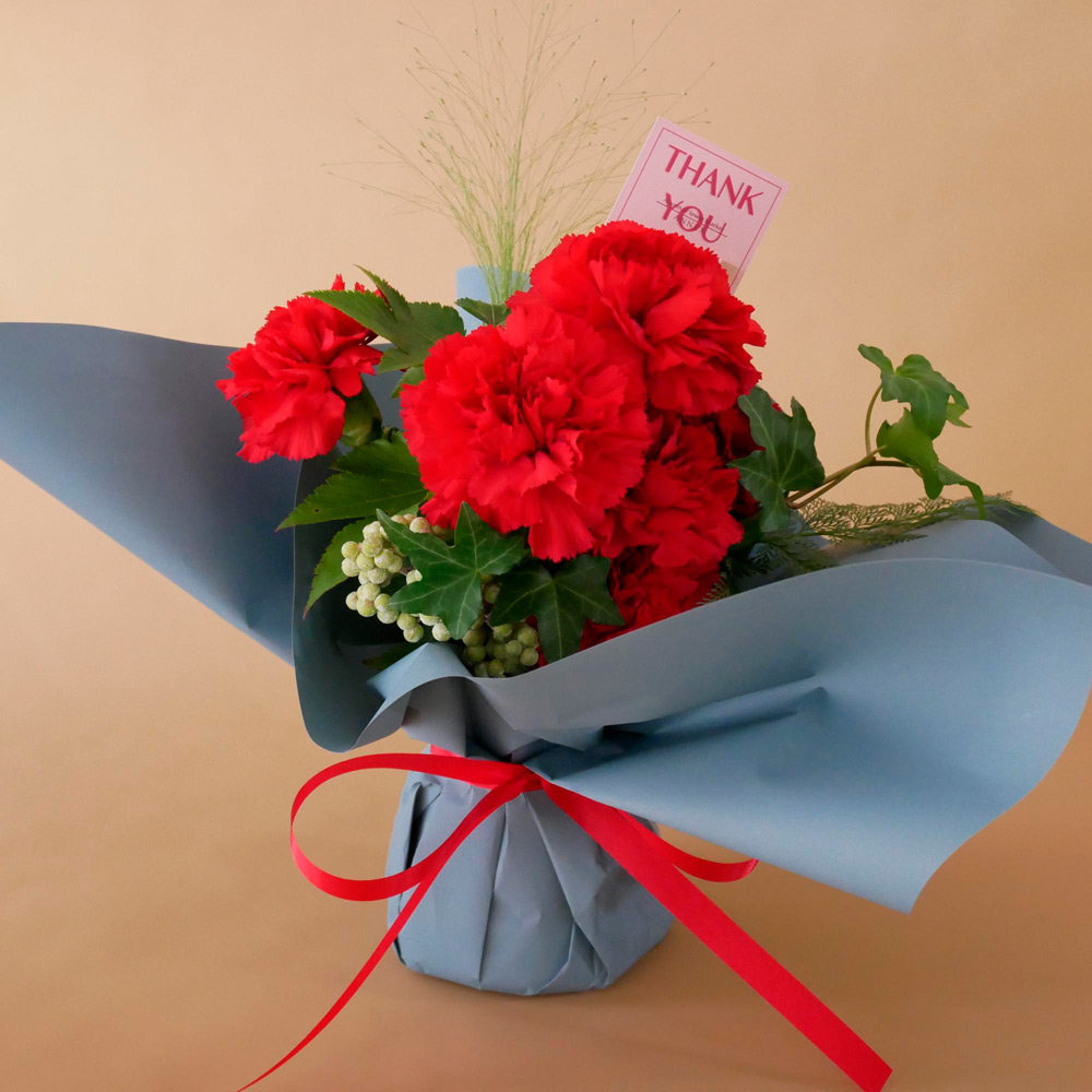 トレンド感のあるブルーのラッピングが、情熱的な赤いカーネーションを引き立てます。保水ゼリーの入った器にブーケを活けているので、花瓶がなくても自立し、お届けから数日は水換えなしで楽しめます。「ありがとう」の気持ちを込めた母の日ギフトにぴったりです。