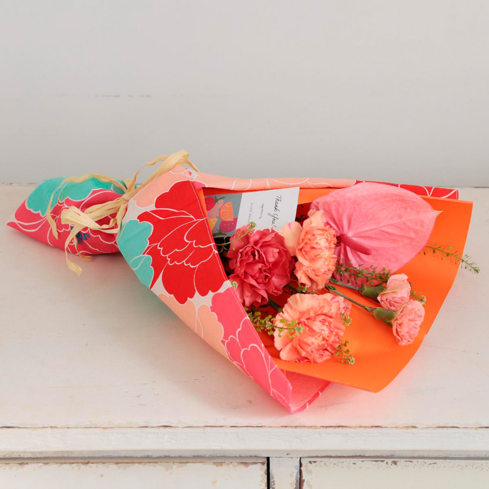 家族の時間に華を添える、優しく温かい色合いの花束。牡丹の花が描かれた風呂敷は、ランチョンマットやティッシュカバーなど多様にお使いいただけます。
