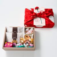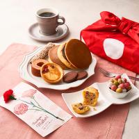 しっとりと柔らかくて食べやすいものや、人気の素材の味わいを楽しめる和菓子と洋菓子をバラエティ豊かに詰め合わせ、一輪挿しのカーネーションを添えました。縁起のよい「七宝」デザインの風呂敷はエコバッグにも活用できる、母の日の感謝を伝えるギフトです。