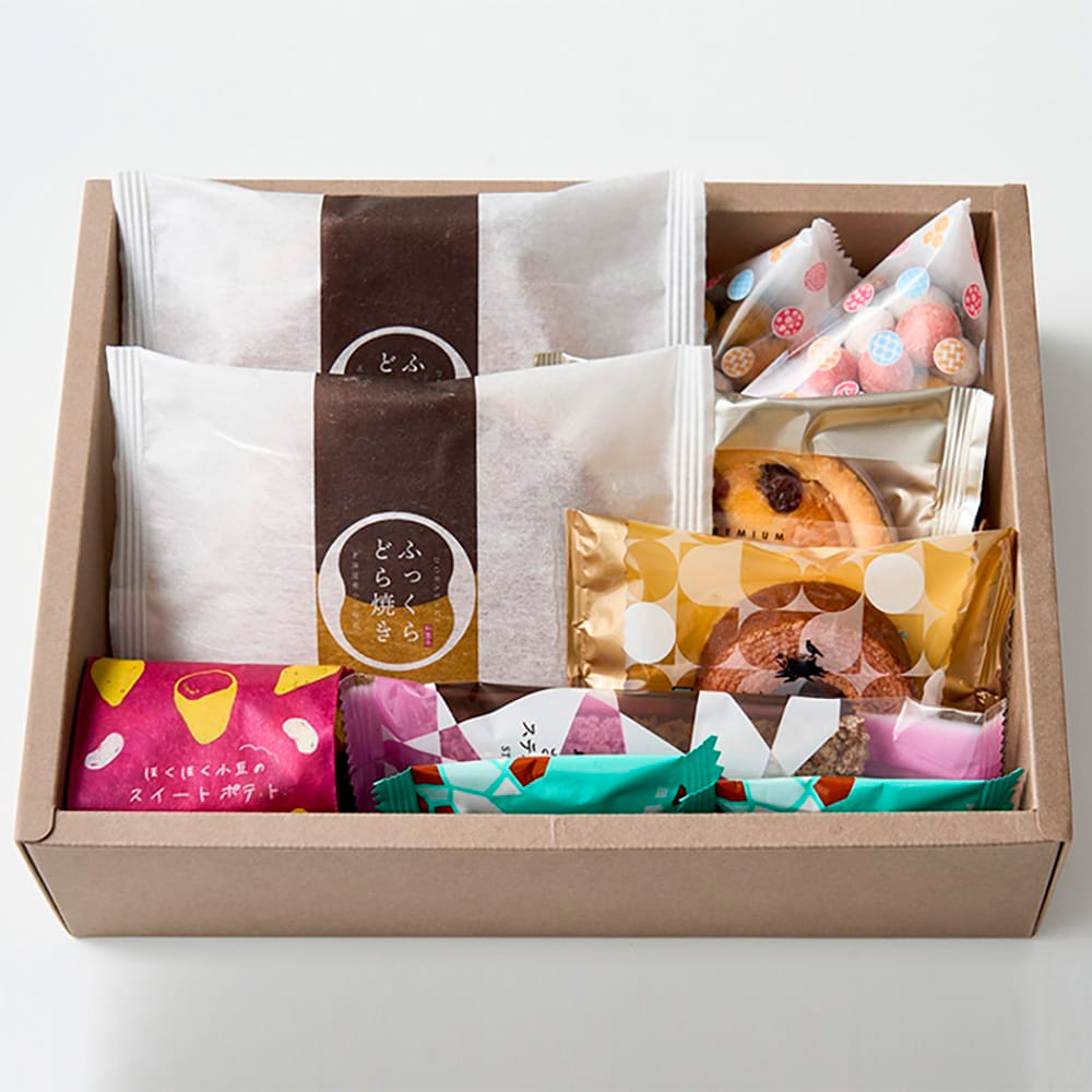 ふっくらどら焼き×2個、ほくほく小豆のスイートポテト×1個、フルーツタルト×1個、焼きショコラ×2個、五色豆×2個、さくさくスティックパイ(ショコラ)×1個、しっとりバームクーヘン(苺)×1個、花一輪挿しカード付(造花)