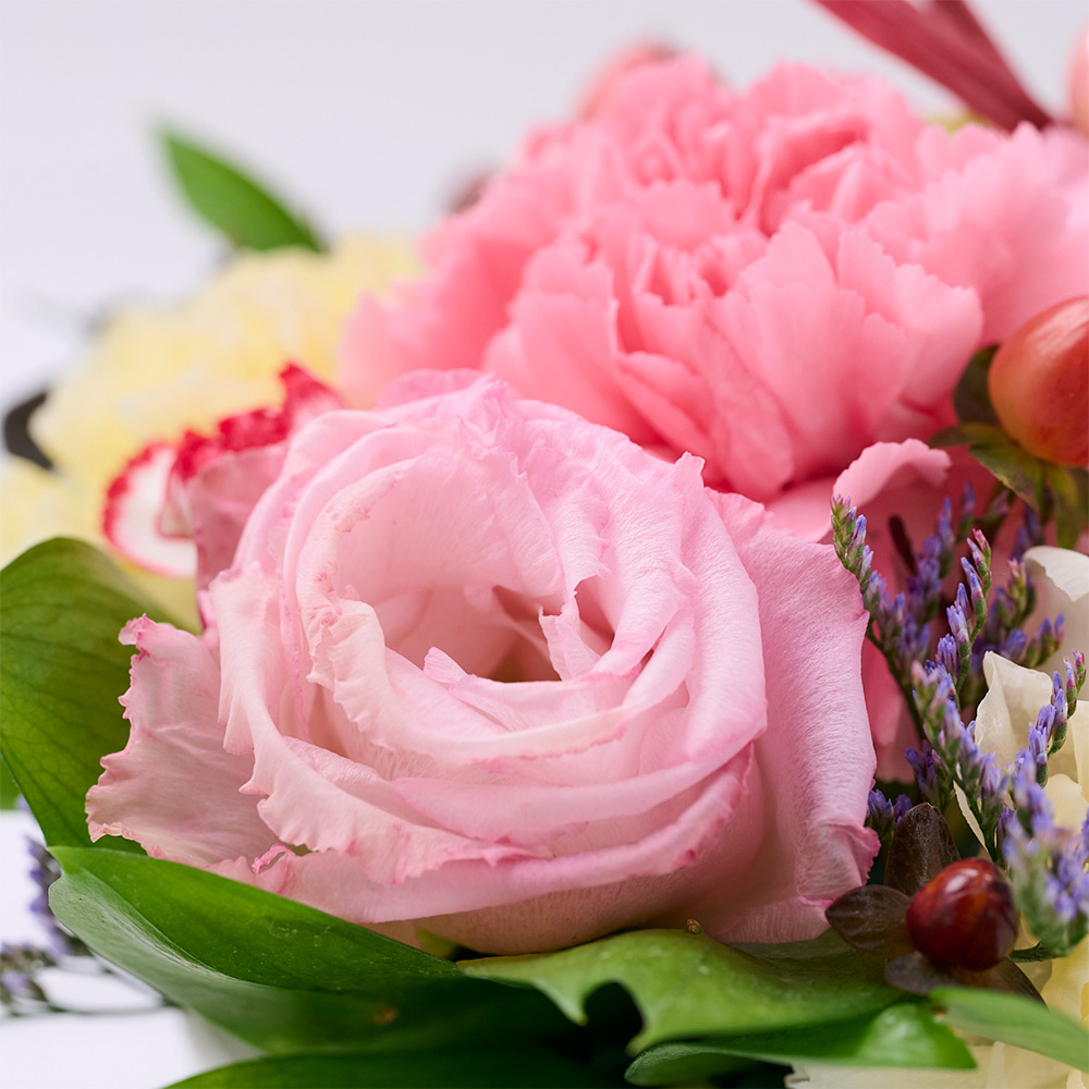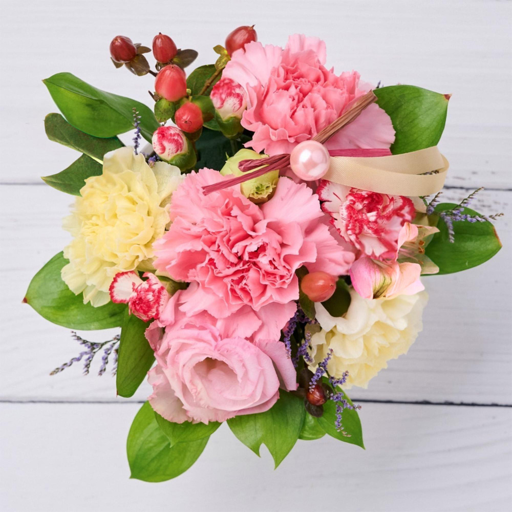 母の日の贈りものに。カーネーションを中心とした優しさ溢れるアレンジメントです。