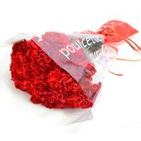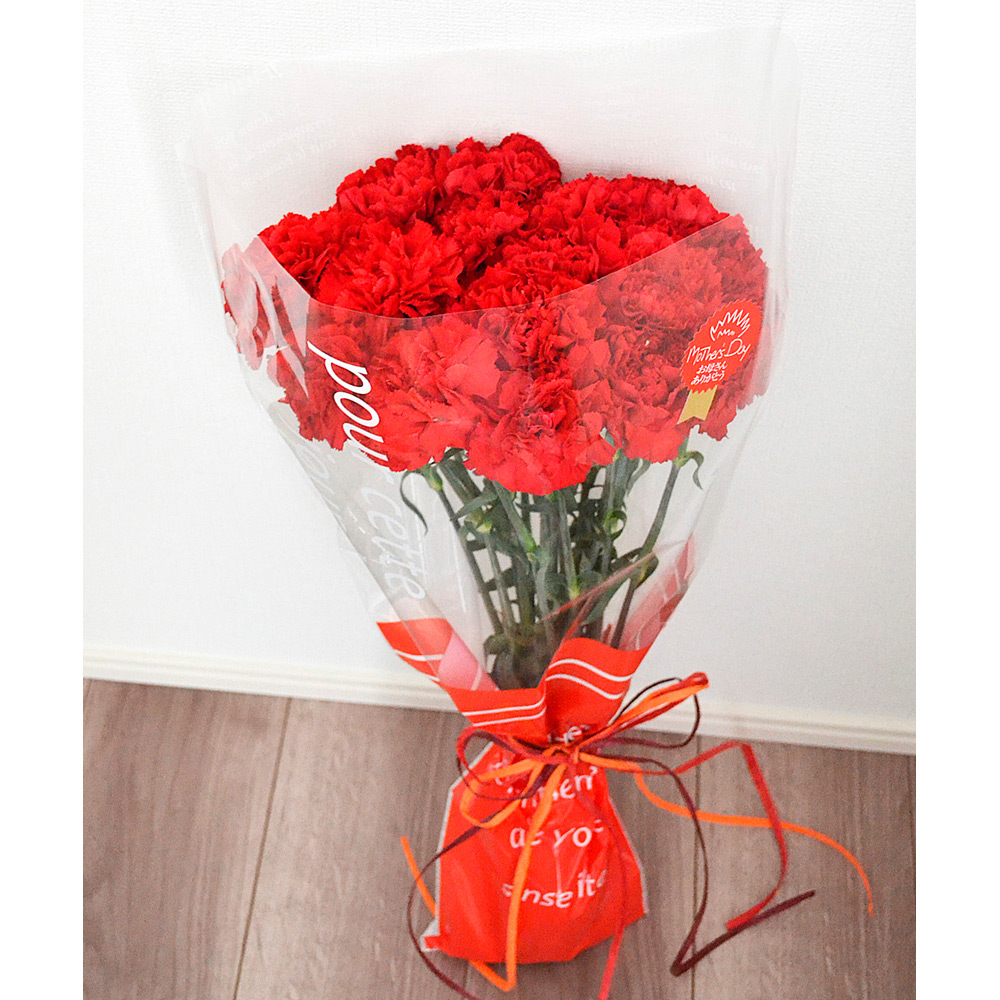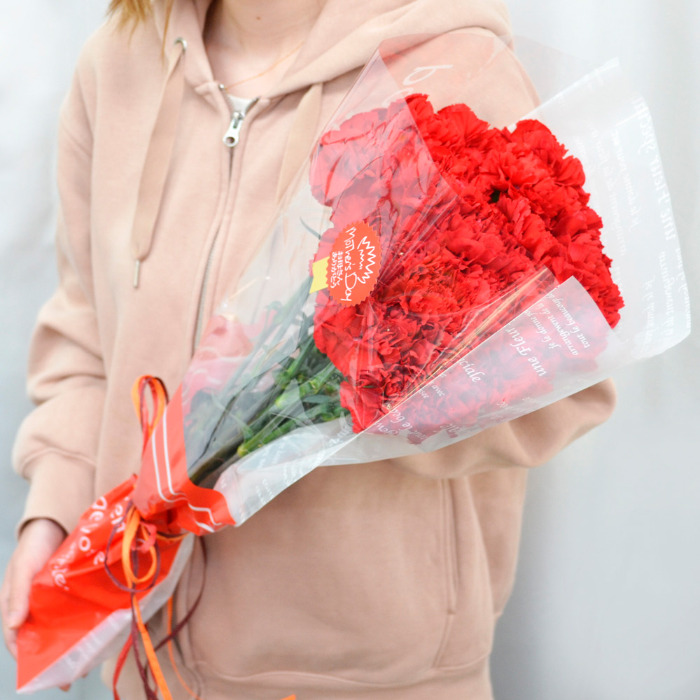 母の日にもらって嬉しい赤いカーネーション。同じカーネーションでも鉢花にはない大輪の花が集まった華やかさが花束にはあります。毎年贈りたくなる赤いカーネーションだけの花束です。