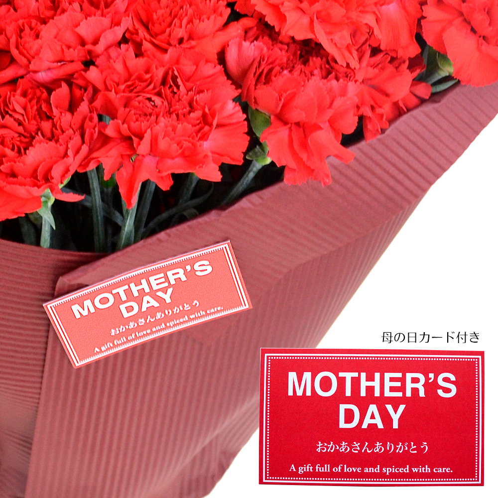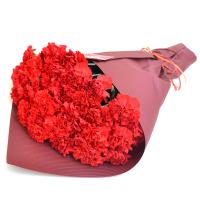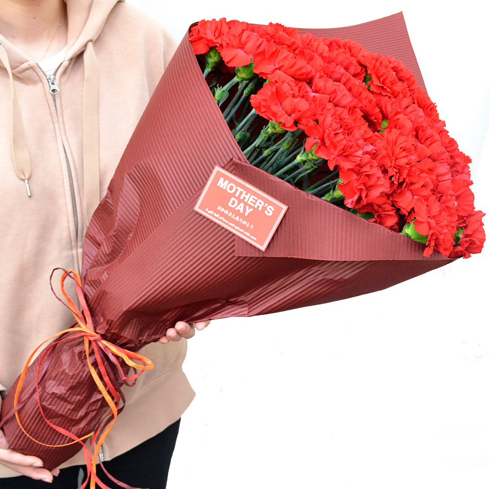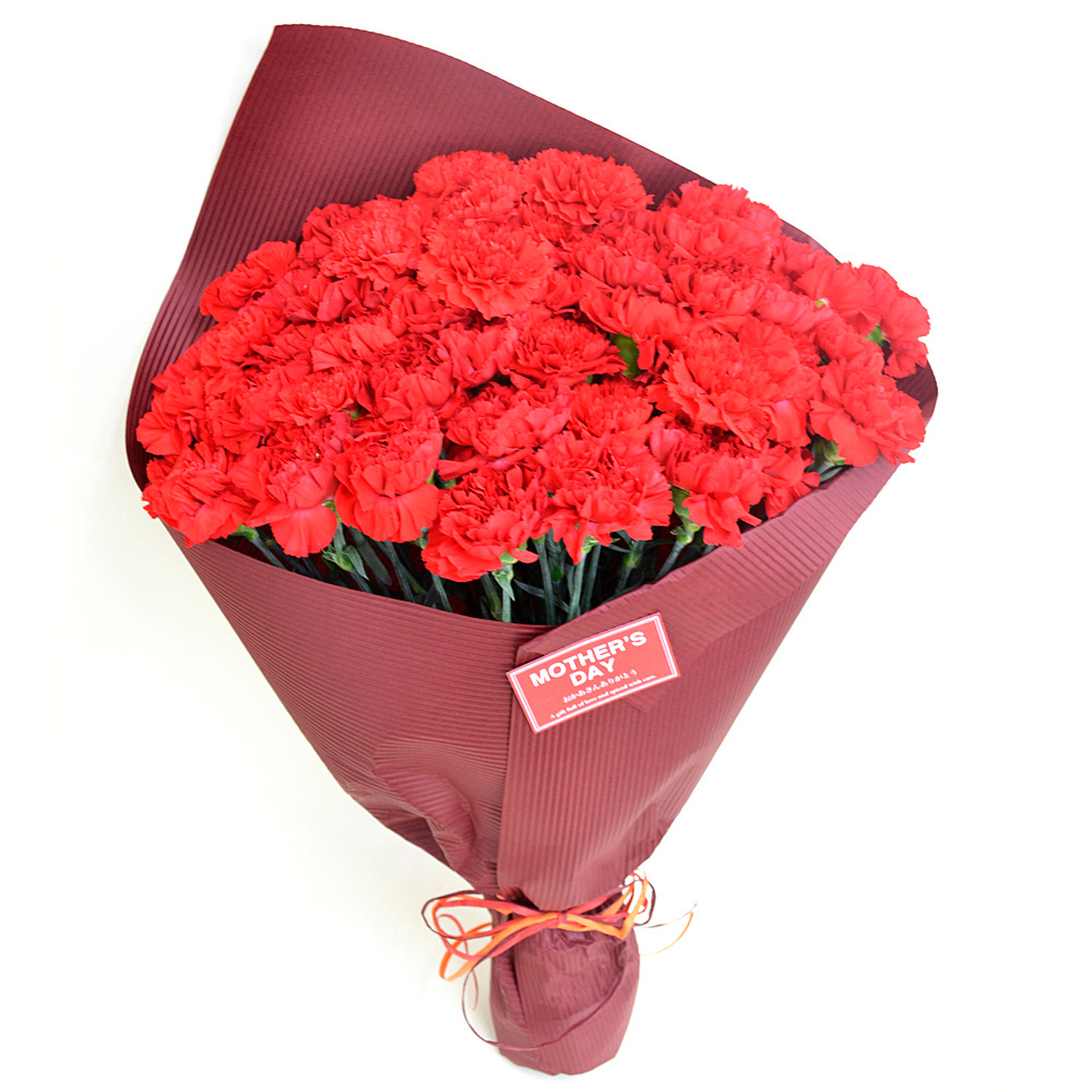 定番だけど母の日にもらって嬉しい赤いカーネーション。同じカーネーションでも鉢花にはない大輪の花が集まった花束だから出せる長さ、ボリューム、豪華さはフラワーギフトとしていつまでも心に残ります。50本のボリュームは感動の花束です。