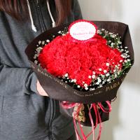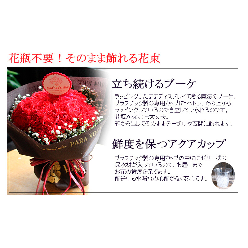 赤いカーネーションを際立たせるカスミソウとグリーンをプラスしたシンプルだけど華やかな花束です。そのまま飾れる立つブーケタイプの花束なので花瓶がなくても安心。上品でおしゃれな花束はこだわりのギフトとしてお勧めです。