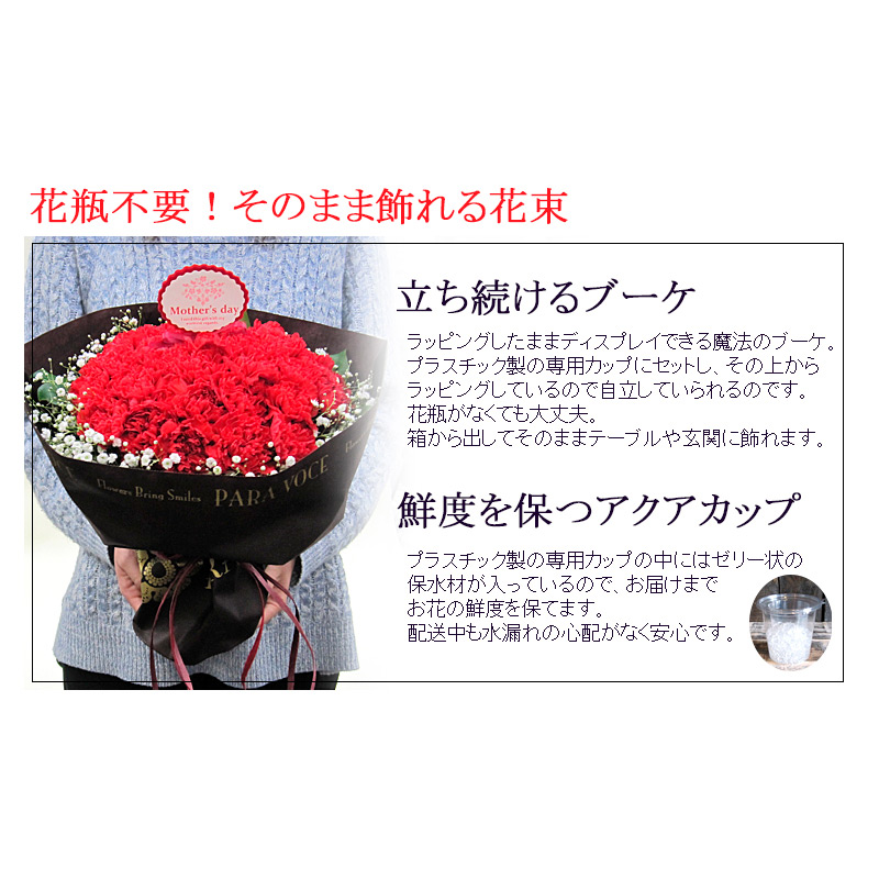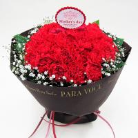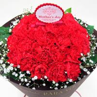赤いカーネーションを際立たせるカスミソウとグリーンをプラスしたシンプルだけど華やかな花束です。そのまま飾れる立つブーケタイプの花束なので花瓶がなくても安心。上品でおしゃれな花束はこだわりのギフトとしてお勧めです。