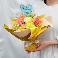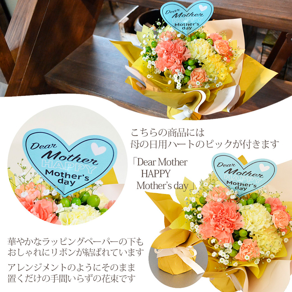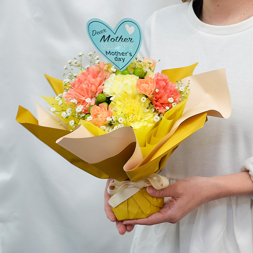 母の日に人気のカーネーションをイエローとオレンジで可愛くアレンジし華やかにラッピングしたスタンディングブーケです。花瓶がなくても置くだけ簡単。ラッピングを外さずそのまま飾れて手間いらずの花束です。保水ゼリーが入っているので水やり不要でしばらくの間お花をいきいきと保ってくれます。