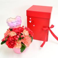 生花アレンジメント、「おかあさん いつもありがとう」の風船メッセージピック付、ギフトボックス入り