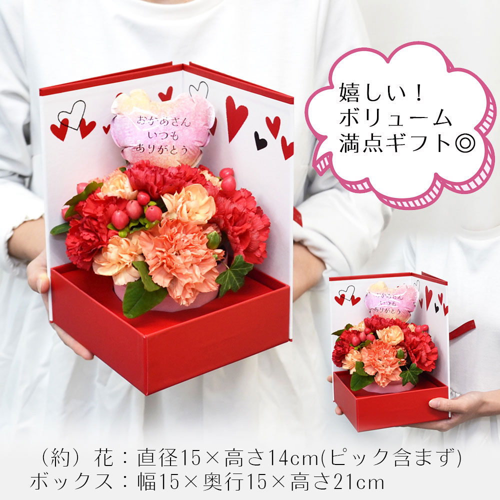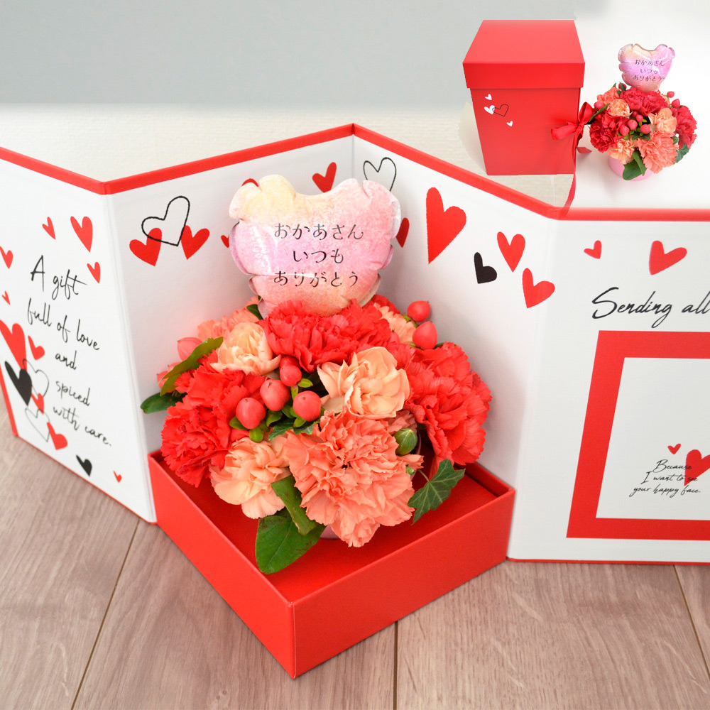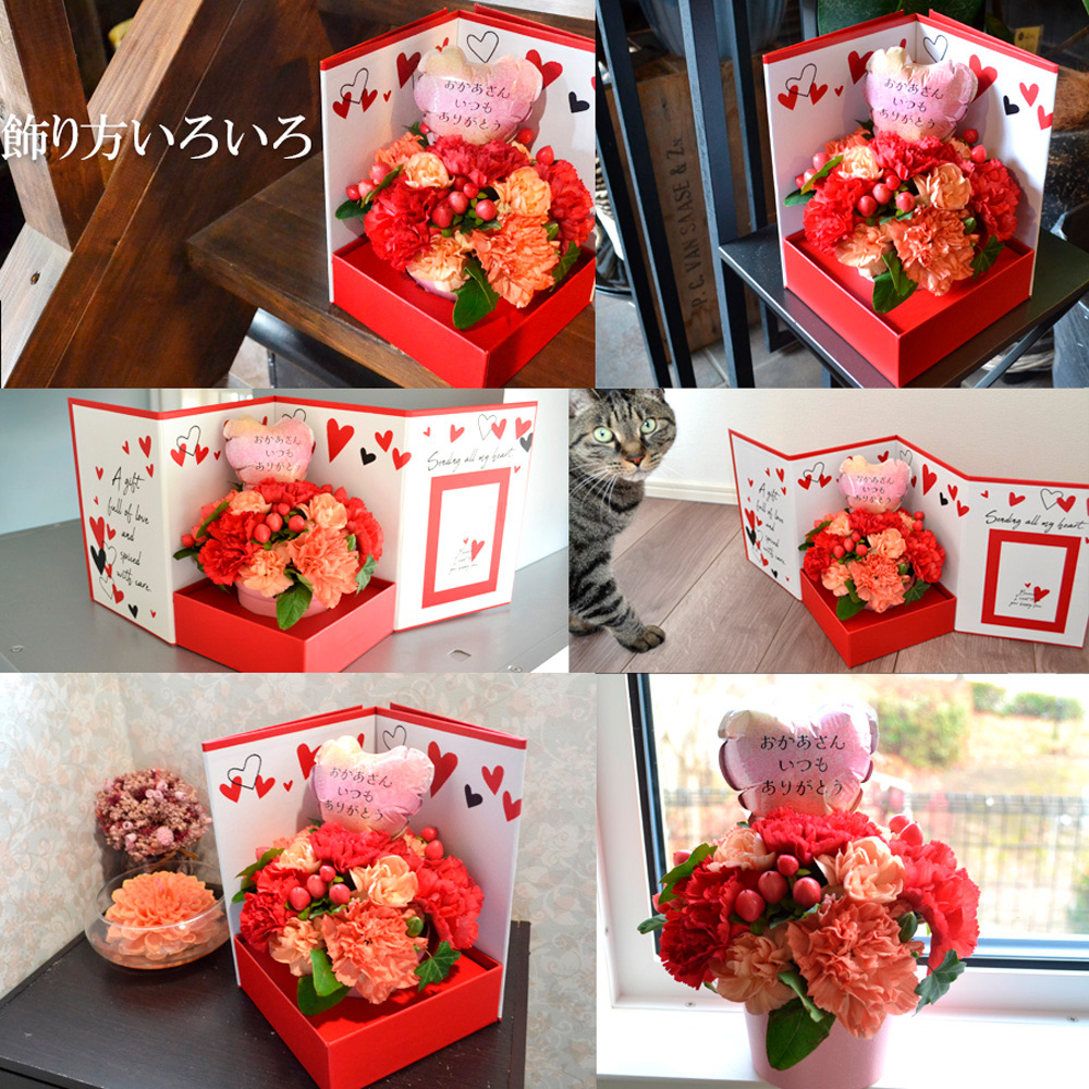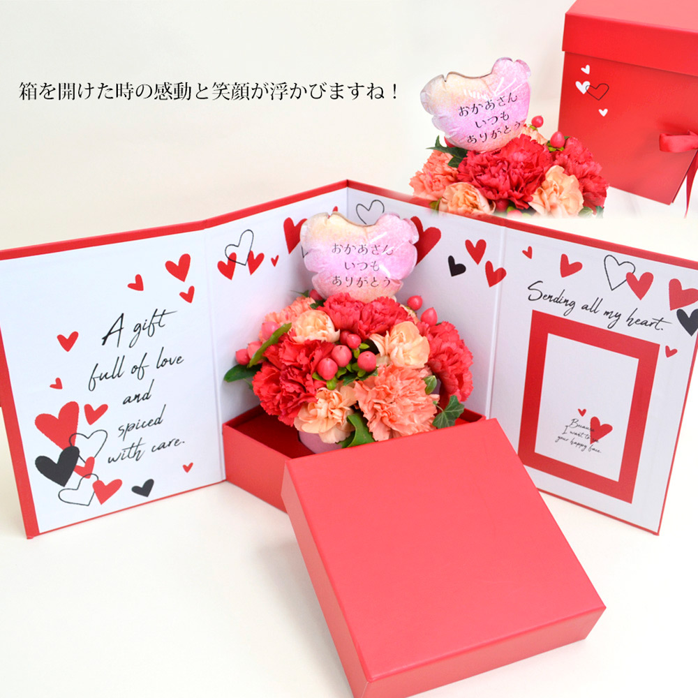 愛をこめて贈る、特別なフラワーボックス。箱を開くと、感謝の気持ちとともにお花が現れるサプライズ感あふれるフラワーボックスです。赤を基調にした華やかなアレンジに、「おかあさん いつもありがとう」のメッセージを添え、想いがしっかり伝わるデザインに仕上げました。箱を開けるとステージのように飾れるおしゃれなボックスにセットした商品で飾り方もいろいろ楽しめます。