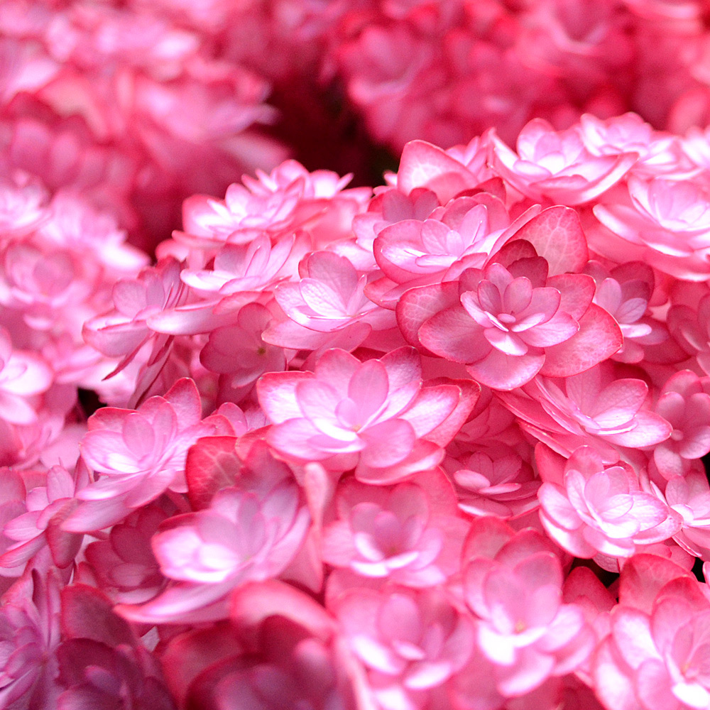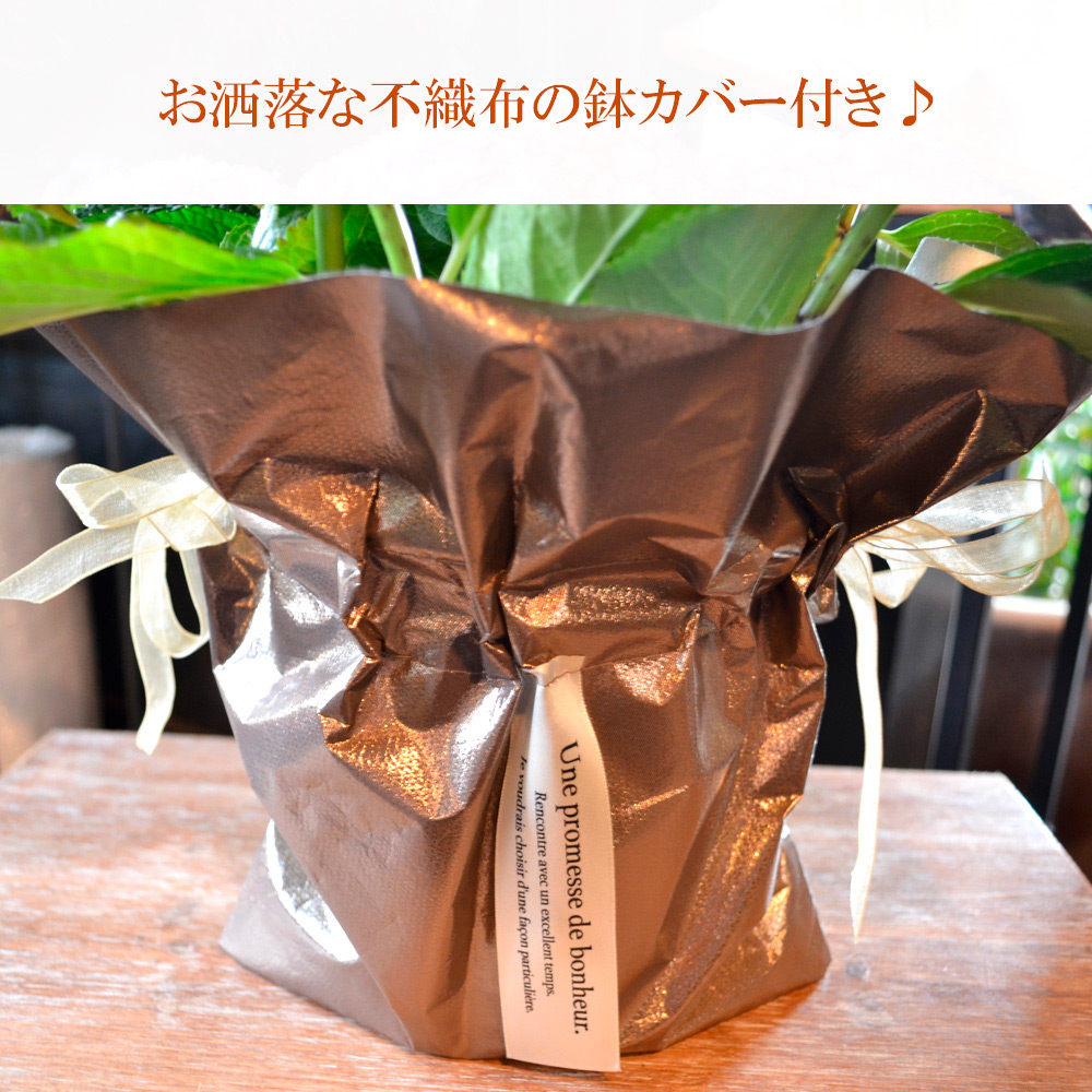 淡いピンクと対照的な濃い縁取りが美しい、かわいらしく温かみのある八重咲、テマリ型のアジサイです。紫陽花は「家族団らん」という花言葉があります。可愛いお花が集まっているように仲良し家族のお母さんに贈るギフトとしてはぴったりですね。上品なパール感ある不織布鉢カバー付きなのでギフトとしてもインテリアとしてもおすすめです。