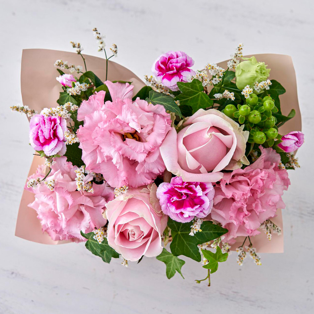 生花:バラ、リシアンサス、スターチス、スプレーカーネーション、ヒペリカム、グリーン