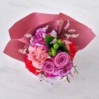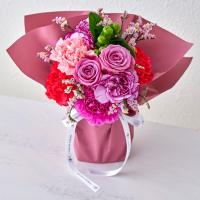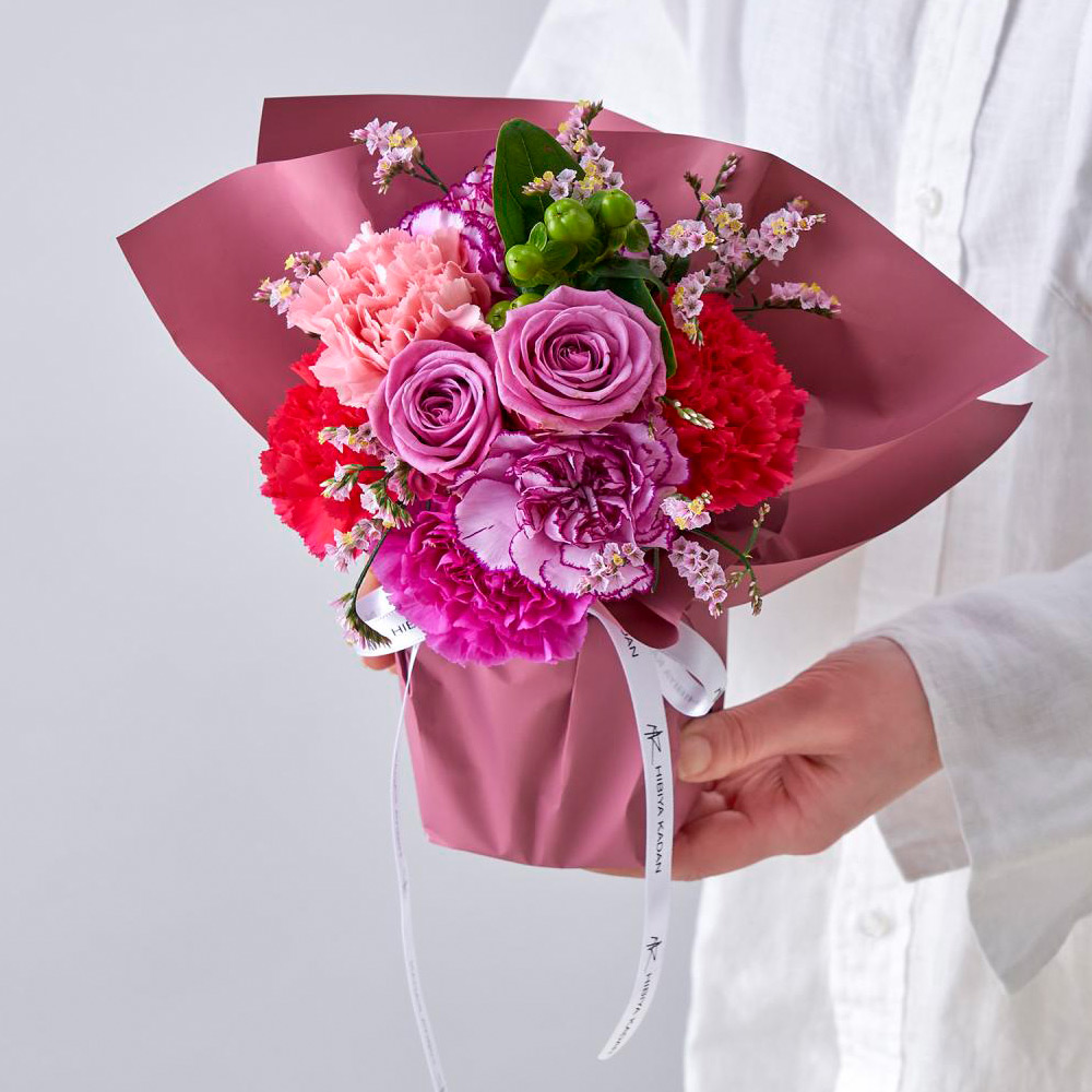 感謝の気持ちと、心穏やかな毎日への願いを込めて。優雅な花束と老舗果実専門店のジュースをセットでお届けします。ブーケは、日比谷花壇のデザイナー西澤真実子さんが手掛けた特別デザイン。エレガントなパープル系のバラとピンク系のカーネーションを主役にまとめた、洗練された大人のためのカラーリングです。お手入れが簡単な「そのまま飾れるブーケ」なら、受け取ってすぐに上品で心安らぐ彩りをお部屋に添えていただけます。一緒にお届けするのは、<銀座千疋屋> の銀座ストレートジュース 5本入。果実本来の香りや風味を追い求めた、無添加・砂糖不使用の上質なストレートジュースです。果実そのままの製法: 濃縮還元せず、生の果物を扱うことで、果実そのものを味わうような満足感が得られる「ストレート」製法を採用しています。この製法により、自然な甘みと味わいを堪能できるすっきりとした後味を実現しました。詰め合わせ(5種):みかん: 国産の温州みかんをぎゅっと搾った、みかんの美味しさをそのまま味わえるストレートジュースです。ぶどう: 甘味・酸味のバランスがよく、香り豊かなコンコード種のぶどうを使用。りんご: 国産のりんごを使用し、数種類の品種をブレンドしたまろやかな口当たり。グレープフルーツ: 太陽をたっぷり浴びた果汁をそのまま詰めた、程よい酸味。パイナップル: 芳醇な香りと、バランスのとれた甘味・酸味が特徴のコスタリカ産。エレガントな花と、果実の生命力あふれる上質なジュースで、お母さまへ洗練された癒やしの時間をお届けします。