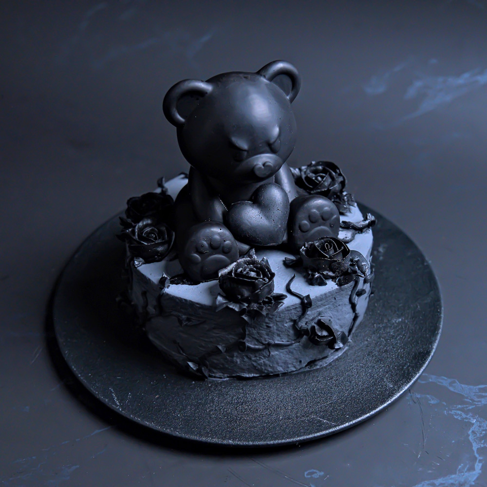 黒薔薇と黒荊が描く静謐なオールブラックのショートケーキに、黒いハートを抱えたテディベアを重ねた、BLVCK PARISの二層ケーキ。下段はローズシロップが香る軽やかなスポンジとフランボワーズの酸味、上段はアールグレイ香るチョコムースとローズブリュレの余韻。造形美と香りのレイヤーが呼応し、テーブルに置いた瞬間から空間まで演出します。誕生日や記念日、サプライズの主役にふさわしい一台です。