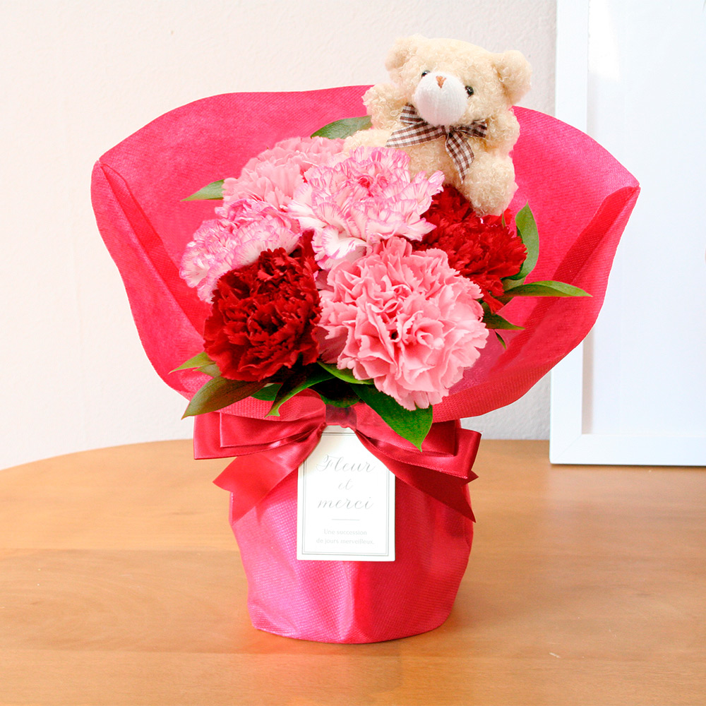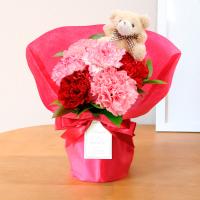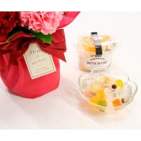 赤とピンクのカーネーションブーケと、さっぱりとした味わいのYOKOHAMA蜜豆のセットギフトです