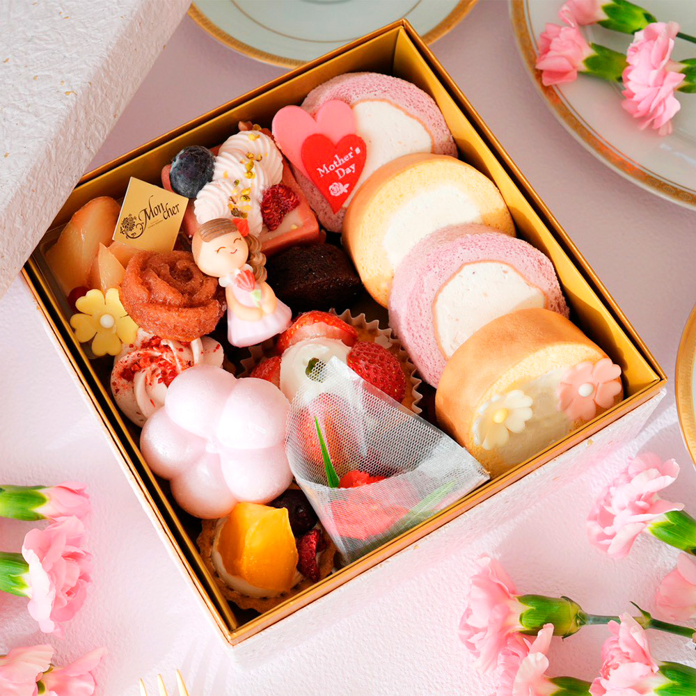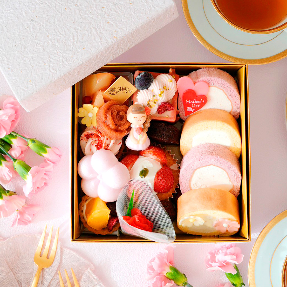 ミニロール(バニラ・ベリー)×各2、フィナンシェショコラミニ×2、ムースピスタチオルージュ、桃プリン、ベリークリームタルト、梅ロッシェ、フルーツタルト、ストロベリーケーキ、ミニバラのフィナンシェ(フランボワーズ)、スマイルママ(砂糖菓子)、母の日ダブルハート(ハート型チョコ菓子)、お花型チョコ(ピンク・白・黄)、果実(フランボワーズ×5・ブルーベリー)、造花(カーネーションピック)