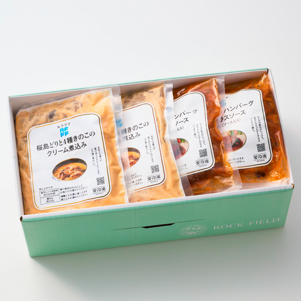 【冷凍便でお届けします。】きのこの旨みが美味なデミグラスソースの牛肉100%旨みたっぷりの「ハンバーグ」、野菜の旨みがぎゅっと詰まったトマトソースで煮込んだ「ロールキャベツ」、コク深い味わいの「桜島どりと4種きのこのクリーム煮込み」を詰め合わせました。湯せんするだけで本格煮込み料理を楽しめる贅沢なセットです。