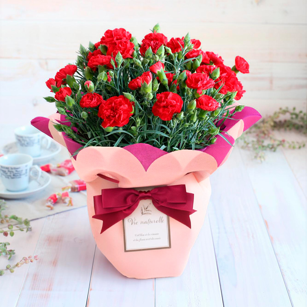 スタンダードな贈りものとして好まれる赤いカーネーションの鉢植えです。鮮やかな色のカーネーションとともに日ごろの感謝の気持ちを込めて贈りませんか。※お届け時は、つぼみを含む状態で出荷します。気温により開花速度は変わりますが、だんだん咲くお花をお楽しみください。